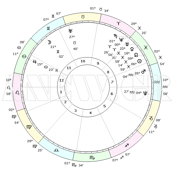 | | ΘΕΣΕΙΣ ΠΛΑΝΗΤΩΝ ΑΣΤΡΟΛΟΓΙΚΟΥ ΧΑΡΤΗ ΤΗΣ ΣΤΙΓΜΗΣ ΑΥΤΗΣ | | | | Πλανήτης | Ζώδιο | Μοίρες | Δεκαήμ. | Σε οίκο | Απόκλιση | | Ακμές των οίκων | | Ηλιος | Ιχθείς | 06°55' | Πρώτο | 8 | 08 S 58 | | 1ος | 23°57' | Καρκίνος | | Σελήνη | Δίδυμοι | 20°12' | Τρίτο | 11 | 28 N 14 | | 2ος | 14°38' | Λέων | | Ερμής | Ιχθείς | 22°31' | Τρίτο | 9 | 00 S 34 | | 3ος | 08°53' | Παρθένος | | Αφροδίτη | Ιχθείς | 18°53' | Δεύτερο | 9 | 05 S 41 | | 4ος | 09°05' | Ζυγός | | Αρης | Υδροχόος | 26°01' | Τρίτο | 8 | 13 S 52 | | 5ος | 15°10' | Σκορπιός | | Δίας | Καρκίνος | 15°23'R | Δεύτερο | 12 | 22 N 53 | | 6ος | 21°54' | Τοξότης | | Κρόνος | Κριός | 01°26' | Πρώτο | 9 | 01 S 24 | | 7ος | 23°57' | Αιγόκερως | | Ουρανός | Ταύρος | 27°40' | Τρίτο | 11 | 19 N 27 | | 8ος | 14°38' | Υδροχόος | | Ποσειδώνας | Κριός | 00°56' | Πρώτο | 9 | 00 S 50 | | 9ος | 08°53' | Ιχθείς | | Πλούτωνας | Υδροχόος | 04°26' | Πρώτο | 7 | 22 S 53 | | 10ος | 09°05' | Κριός | | Β. Δεσμός | Ιχθείς | 09°14' | Πρώτο | 9 | 08 S 06 | | 11ος | 15°10' | Ταύρος | | Ωροσκόπος | Καρκίνος | 23°57' | Τρίτο | | | 12ος | 21°54' | Δίδυμοι | | Μεσουράνημα | Κριός | 09°05' | Πρώτο | | | |