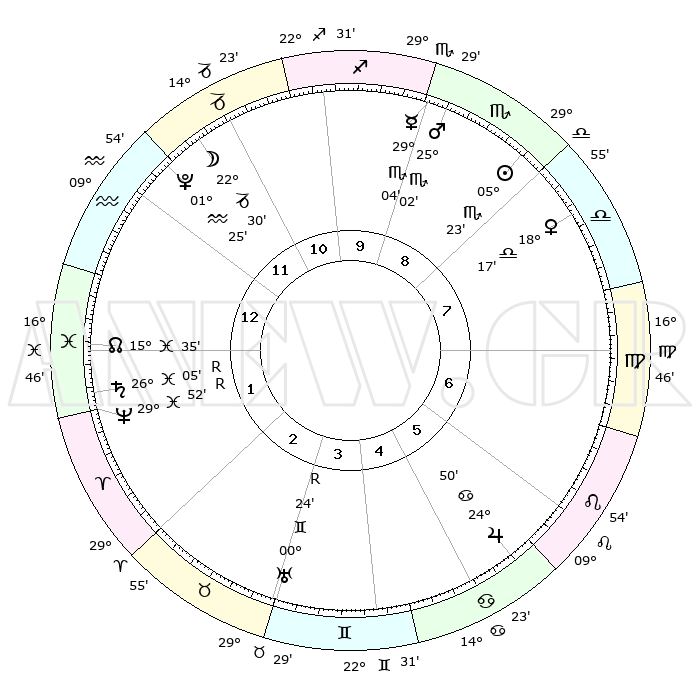 | | ΘΕΣΕΙΣ ΠΛΑΝΗΤΩΝ ΑΣΤΡΟΛΟΓΙΚΟΥ ΧΑΡΤΗ ΤΗΣ ΣΤΙΓΜΗΣ ΑΥΤΗΣ | | | | Πλανήτης | Ζώδιο | Μοίρες | Δεκαήμ. | Σε οίκο | Απόκλιση | | Ακμές των οίκων | | Ηλιος | Σκορπιός | 04°59' | Πρώτο | 1 | 13 S 11 | | 1ος | 22°10' | Ζυγός | | Σελήνη | Αιγόκερως | 17°35' | Δεύτερο | 3 | 26 S 40 | | 2ος | 20°08' | Σκορπιός | | Ερμής | Σκορπιός | 28°39' | Τρίτο | 2 | 22 S 35 | | 3ος | 21°33' | Τοξότης | | Αφροδίτη | Ζυγός | 17°47' | Δεύτερο | 12 | 05 S 35 | | 4ος | 25°15' | Αιγόκερως | | Αρης | Σκορπιός | 24°45' | Τρίτο | 2 | 19 S 18 | | 5ος | 28°13' | Υδροχόος | | Δίας | Καρκίνος | 24°48' | Τρίτο | 9 | 21 N 14 | | 6ος | 27°31' | Ιχθείς | | Κρόνος | Ιχθείς | 26°07'R | Τρίτο | 5 | 03 S 49 | | 7ος | 22°10' | Κριός | | Ουρανός | Δίδυμοι | 00°25'R | Πρώτο | 8 | 20 N 02 | | 8ος | 20°08' | Ταύρος | | Ποσειδώνας | Ιχθείς | 29°52'R | Τρίτο | 6 | 01 S 19 | | 9ος | 21°33' | Δίδυμοι | | Πλούτωνας | Υδροχόος | 01°25' | Πρώτο | 4 | 23 S 31 | | 10ος | 25°15' | Καρκίνος | | Β. Δεσμός | Ιχθείς | 15°36' | Δεύτερο | 5 | 05 S 41 | | 11ος | 28°13' | Λέων | | Ωροσκόπος | Ζυγός | 22°10' | Τρίτο | | | 12ος | 27°31' | Παρθένος | | Μεσουράνημα | Καρκίνος | 25°15' | Τρίτο | | | |