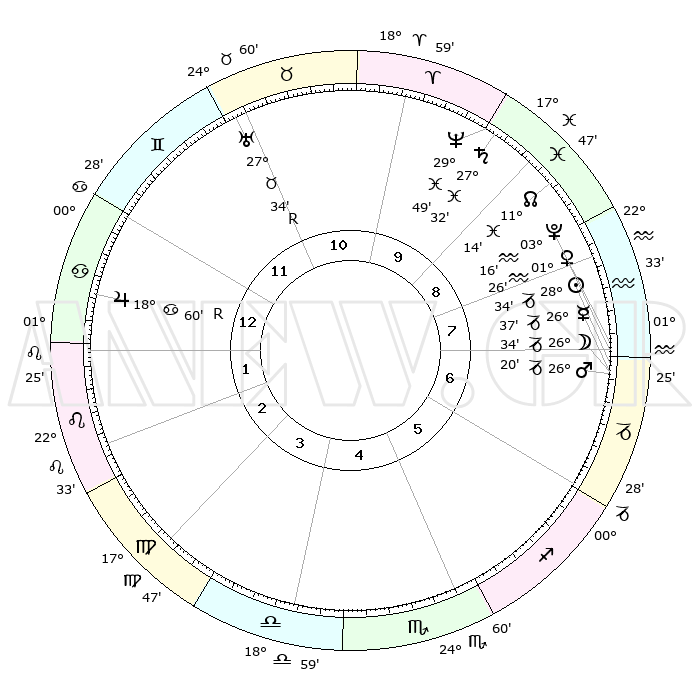 | | ΘΕΣΕΙΣ ΠΛΑΝΗΤΩΝ ΑΣΤΡΟΛΟΓΙΚΟΥ ΧΑΡΤΗ ΤΗΣ ΣΤΙΓΜΗΣ ΑΥΤΗΣ | | | | Πλανήτης | Ζώδιο | Μοίρες | Δεκαήμ. | Σε οίκο | Απόκλιση | | Ακμές των οίκων | | Ηλιος | Αιγόκερως | 28°30' | Τρίτο | 7 | 20 S 27 | | 1ος | 12°32' | Καρκίνος | | Σελήνη | Αιγόκερως | 25°47' | Τρίτο | 7 | 24 S 29 | | 2ος | 02°58' | Λέων | | Ερμής | Αιγόκερως | 26°31' | Τρίτο | 7 | 22 S 46 | | 3ος | 25°51' | Λέων | | Αφροδίτη | Υδροχόος | 01°21' | Πρώτο | 7 | 20 S 54 | | 4ος | 24°14' | Παρθένος | | Αρης | Αιγόκερως | 26°17' | Τρίτο | 7 | 21 S 52 | | 5ος | 29°46' | Ζυγός | | Δίας | Καρκίνος | 19°00'R | Δεύτερο | 1 | 22 N 22 | | 6ος | 08°20' | Τοξότης | | Κρόνος | Ιχθείς | 27°32' | Τρίτο | 10 | 03 S 00 | | 7ος | 12°32' | Αιγόκερως | | Ουρανός | Ταύρος | 27°34'R | Τρίτο | 11 | 19 N 26 | | 8ος | 02°58' | Υδροχόος | | Ποσειδώνας | Ιχθείς | 29°49' | Τρίτο | 10 | 01 S 17 | | 9ος | 25°51' | Υδροχόος | | Πλούτωνας | Υδροχόος | 03°16' | Πρώτο | 8 | 23 S 06 | | 10ος | 24°14' | Ιχθείς | | Β. Δεσμός | Ιχθείς | 11°14' | Δεύτερο | 9 | 07 S 21 | | 11ος | 29°46' | Κριός | | Ωροσκόπος | Καρκίνος | 12°32' | Δεύτερο | | | 12ος | 08°20' | Δίδυμοι | | Μεσουράνημα | Ιχθείς | 24°14' | Τρίτο | | | |