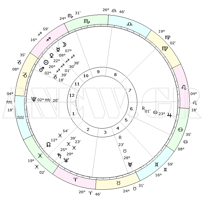 | | ΘΕΣΕΙΣ ΠΛΑΝΗΤΩΝ ΑΣΤΡΟΛΟΓΙΚΟΥ ΧΑΡΤΗ ΤΗΣ ΣΤΙΓΜΗΣ ΑΥΤΗΣ | | | | Πλανήτης | Ζώδιο | Μοίρες | Δεκαήμ. | Σε οίκο | Απόκλιση | | Ακμές των οίκων | | Ηλιος | Τοξότης | 26°20' | Τρίτο | 3 | 23 S 23 | | 1ος | 21°40' | Ζυγός | | Σελήνη | Τοξότης | 03°50' | Πρώτο | 2 | 25 S 46 | | 2ος | 19°36' | Σκορπιός | | Ερμής | Τοξότης | 08°03' | Πρώτο | 2 | 20 S 30 | | 3ος | 20°59' | Τοξότης | | Αφροδίτη | Τοξότης | 21°37' | Τρίτο | 3 | 23 S 08 | | 4ος | 24°40' | Αιγόκερως | | Αρης | Αιγόκερως | 02°03' | Πρώτο | 3 | 24 S 13 | | 5ος | 27°37' | Υδροχόος | | Δίας | Καρκίνος | 23°03'R | Τρίτο | 9 | 21 N 40 | | 6ος | 26°58' | Ιχθείς | | Κρόνος | Ιχθείς | 25°38' | Τρίτο | 5 | 03 S 51 | | 7ος | 21°40' | Κριός | | Ουρανός | Ταύρος | 28°23'R | Τρίτο | 8 | 19 N 36 | | 8ος | 19°36' | Ταύρος | | Ποσειδώνας | Ιχθείς | 29°23' | Τρίτο | 6 | 01 S 28 | | 9ος | 20°59' | Δίδυμοι | | Πλούτωνας | Υδροχόος | 02°19' | Πρώτο | 4 | 23 S 18 | | 10ος | 24°40' | Καρκίνος | | Β. Δεσμός | Ιχθείς | 12°55' | Δεύτερο | 5 | 06 S 43 | | 11ος | 27°37' | Λέων | | Ωροσκόπος | Ζυγός | 21°40' | Τρίτο | | | 12ος | 26°58' | Παρθένος | | Μεσουράνημα | Καρκίνος | 24°40' | Τρίτο | | | |