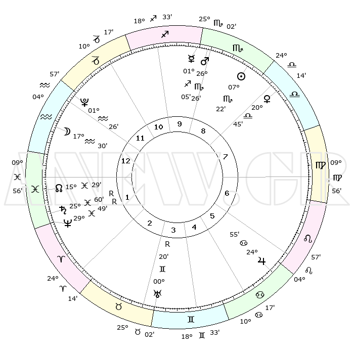 | | ΘΕΣΕΙΣ ΠΛΑΝΗΤΩΝ ΑΣΤΡΟΛΟΓΙΚΟΥ ΧΑΡΤΗ ΤΗΣ ΣΤΙΓΜΗΣ ΑΥΤΗΣ | | | | Πλανήτης | Ζώδιο | Μοίρες | Δεκαήμ. | Σε οίκο | Απόκλιση | | Ακμές των οίκων | | Ηλιος | Σκορπιός | 07°07' | Πρώτο | 11 | 13 S 53 | | 1ος | 05°47' | Τοξότης | | Σελήνη | Υδροχόος | 14°25' | Δεύτερο | 2 | 19 S 09 | | 2ος | 07°47' | Αιγόκερως | | Ερμής | Τοξότης | 00°51' | Πρώτο | 12 | 23 S 08 | | 3ος | 14°28' | Υδροχόος | | Αφροδίτη | Ζυγός | 20°27' | Τρίτο | 10 | 06 S 36 | | 4ος | 20°33' | Ιχθείς | | Αρης | Σκορπιός | 26°16' | Τρίτο | 12 | 19 S 41 | | 5ος | 20°48' | Κριός | | Δίας | Καρκίνος | 24°54' | Τρίτο | 8 | 21 N 13 | | 6ος | 15°05' | Ταύρος | | Κρόνος | Ιχθείς | 26°00'R | Τρίτο | 4 | 03 S 51 | | 7ος | 05°47' | Δίδυμοι | | Ουρανός | Δίδυμοι | 00°20'R | Πρώτο | 6 | 20 N 01 | | 8ος | 07°47' | Καρκίνος | | Ποσειδώνας | Ιχθείς | 29°49'R | Τρίτο | 4 | 01 S 20 | | 9ος | 14°28' | Λέων | | Πλούτωνας | Υδροχόος | 01°26' | Πρώτο | 2 | 23 S 31 | | 10ος | 20°33' | Παρθένος | | Β. Δεσμός | Ιχθείς | 15°29' | Δεύτερο | 3 | 05 S 43 | | 11ος | 20°48' | Ζυγός | | Ωροσκόπος | Τοξότης | 05°47' | Πρώτο | | | 12ος | 15°05' | Σκορπιός | | Μεσουράνημα | Παρθένος | 20°33' | Τρίτο | | | |