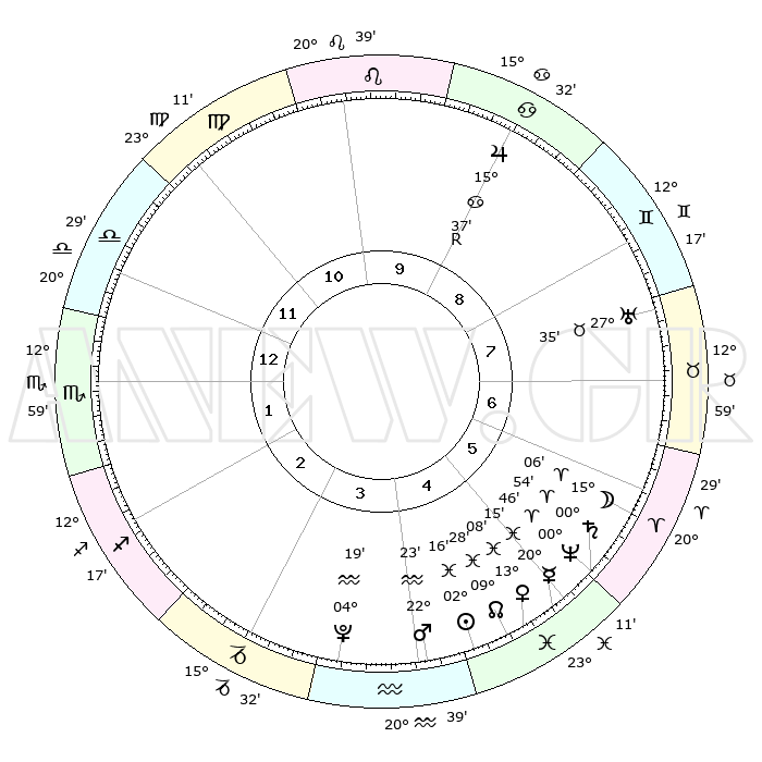 | | ΘΕΣΕΙΣ ΠΛΑΝΗΤΩΝ ΑΣΤΡΟΛΟΓΙΚΟΥ ΧΑΡΤΗ ΤΗΣ ΣΤΙΓΜΗΣ ΑΥΤΗΣ | | | | Πλανήτης | Ζώδιο | Μοίρες | Δεκαήμ. | Σε οίκο | Απόκλιση | | Ακμές των οίκων | | Ηλιος | Ιχθείς | 02°12' | Πρώτο | 5 | 10 S 41 | | 1ος | 22°24' | Ζυγός | | Σελήνη | Κριός | 14°07' | Δεύτερο | 6 | 08 N 23 | | 2ος | 20°22' | Σκορπιός | | Ερμής | Ιχθείς | 20°12' | Τρίτο | 5 | 02 S 32 | | 3ος | 21°48' | Τοξότης | | Αφροδίτη | Ιχθείς | 13°03' | Δεύτερο | 5 | 08 S 00 | | 4ος | 25°31' | Αιγόκερως | | Αρης | Υδροχόος | 22°20' | Τρίτο | 4 | 15 S 06 | | 5ος | 28°28' | Υδροχόος | | Δίας | Καρκίνος | 15°38'R | Δεύτερο | 9 | 22 N 51 | | 6ος | 27°45' | Ιχθείς | | Κρόνος | Κριός | 00°53' | Πρώτο | 6 | 01 S 37 | | 7ος | 22°24' | Κριός | | Ουρανός | Ταύρος | 27°35' | Τρίτο | 8 | 19 N 26 | | 8ος | 20°22' | Ταύρος | | Ποσειδώνας | Κριός | 00°46' | Πρώτο | 6 | 00 S 54 | | 9ος | 21°48' | Δίδυμοι | | Πλούτωνας | Υδροχόος | 04°18' | Πρώτο | 4 | 22 S 55 | | 10ος | 25°31' | Καρκίνος | | Β. Δεσμός | Ιχθείς | 09°29' | Πρώτο | 5 | 08 S 01 | | 11ος | 28°28' | Λέων | | Ωροσκόπος | Ζυγός | 22°24' | Τρίτο | | | 12ος | 27°45' | Παρθένος | | Μεσουράνημα | Καρκίνος | 25°31' | Τρίτο | | | |