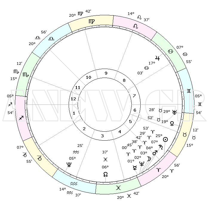| | ΘΕΣΕΙΣ ΠΛΑΝΗΤΩΝ ΑΣΤΡΟΛΟΓΙΚΟΥ ΧΑΡΤΗ ΤΗΣ ΣΤΙΓΜΗΣ ΑΥΤΗΣ | | | | Πλανήτης | Ζώδιο | Μοίρες | Δεκαήμ. | Σε οίκο | Απόκλιση | | Ακμές των οίκων | | Ηλιος | Κριός | 25°49' | Τρίτο | 6 | 09 N 58 | | 1ος | 16°16' | Σκορπιός | | Σελήνη | Κριός | 02°41' | Πρώτο | 5 | 03 N 02 | | 2ος | 15°51' | Τοξότης | | Ερμής | Κριός | 00°55' | Πρώτο | 5 | 02 S 02 | | 3ος | 19°30' | Αιγόκερως | | Αφροδίτη | Ταύρος | 19°47' | Δεύτερο | 7 | 17 N 53 | | 4ος | 24°51' | Υδροχόος | | Αρης | Κριός | 04°39' | Πρώτο | 5 | 00 N 57 | | 5ος | 27°12' | Ιχθείς | | Δίας | Καρκίνος | 17°03' | Δεύτερο | 8 | 22 N 43 | | 6ος | 24°05' | Κριός | | Κρόνος | Κριός | 07°29' | Πρώτο | 5 | 01 N 00 | | 7ος | 16°16' | Ταύρος | | Ουρανός | Ταύρος | 29°28' | Τρίτο | 7 | 19 N 52 | | 8ος | 15°51' | Δίδυμοι | | Ποσειδώνας | Κριός | 02°45' | Πρώτο | 5 | 00 S 07 | | 9ος | 19°30' | Καρκίνος | | Πλούτωνας | Υδροχόος | 05°24' | Πρώτο | 3 | 22 S 47 | | 10ος | 24°51' | Λέων | | Β. Δεσμός | Ιχθείς | 06°37' | Πρώτο | 4 | 09 S 05 | | 11ος | 27°12' | Παρθένος | | Ωροσκόπος | Σκορπιός | 16°16' | Δεύτερο | | | 12ος | 24°05' | Ζυγός | | Μεσουράνημα | Λέων | 24°51' | Τρίτο | | | |