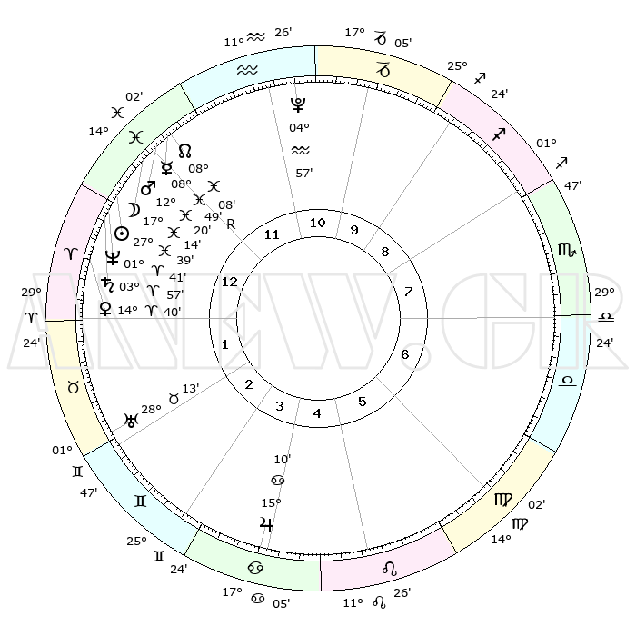 | | ΘΕΣΕΙΣ ΠΛΑΝΗΤΩΝ ΑΣΤΡΟΛΟΓΙΚΟΥ ΧΑΡΤΗ ΤΗΣ ΣΤΙΓΜΗΣ ΑΥΤΗΣ | | | | Πλανήτης | Ζώδιο | Μοίρες | Δεκαήμ. | Σε οίκο | Απόκλιση | | Ακμές των οίκων | | Ηλιος | Ιχθείς | 27°35' | Τρίτο | 1 | 00 S 58 | | 1ος | 19°45' | Ιχθείς | | Σελήνη | Ιχθείς | 16°18' | Δεύτερο | 12 | 04 S 47 | | 2ος | 02°19' | Ταύρος | | Ερμής | Ιχθείς | 08°51'R | Πρώτο | 12 | 06 S 44 | | 3ος | 01°23' | Δίδυμοι | | Αφροδίτη | Κριός | 14°35' | Δεύτερο | 1 | 04 N 52 | | 4ος | 24°13' | Δίδυμοι | | Αρης | Ιχθείς | 12°17' | Δεύτερο | 12 | 07 S 57 | | 5ος | 16°09' | Καρκίνος | | Δίας | Καρκίνος | 15°10' | Δεύτερο | 4 | 22 N 56 | | 6ος | 12°04' | Λέων | | Κρόνος | Κριός | 03°56' | Πρώτο | 1 | 00 S 23 | | 7ος | 19°45' | Παρθένος | | Ουρανός | Ταύρος | 28°13' | Τρίτο | 2 | 19 N 35 | | 8ος | 02°19' | Σκορπιός | | Ποσειδώνας | Κριός | 01°41' | Πρώτο | 1 | 00 S 32 | | 9ος | 01°23' | Τοξότης | | Πλούτωνας | Υδροχόος | 04°57' | Πρώτο | 11 | 22 S 49 | | 10ος | 24°13' | Τοξότης | | Β. Δεσμός | Ιχθείς | 08°08' | Πρώτο | 12 | 08 S 31 | | 11ος | 16°09' | Αιγόκερως | | Ωροσκόπος | Ιχθείς | 19°45' | Δεύτερο | | | 12ος | 12°04' | Υδροχόος | | Μεσουράνημα | Τοξότης | 24°13' | Τρίτο | | | |