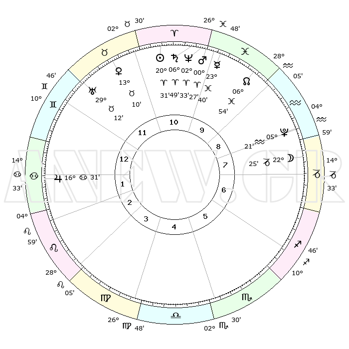 | | ΘΕΣΕΙΣ ΠΛΑΝΗΤΩΝ ΑΣΤΡΟΛΟΓΙΚΟΥ ΧΑΡΤΗ ΤΗΣ ΣΤΙΓΜΗΣ ΑΥΤΗΣ | | | | Πλανήτης | Ζώδιο | Μοίρες | Δεκαήμ. | Σε οίκο | Απόκλιση | | Ακμές των οίκων | | Ηλιος | Κριός | 20°27' | Τρίτο | 11 | 07 N 59 | | 1ος | 21°14' | Δίδυμοι | | Σελήνη | Αιγόκερως | 21°33' | Τρίτο | 8 | 25 S 25 | | 2ος | 12°45' | Καρκίνος | | Ερμής | Ιχθείς | 23°35' | Τρίτο | 10 | 04 S 43 | | 3ος | 04°07' | Λέων | | Αφροδίτη | Ταύρος | 13°05' | Δεύτερο | 12 | 15 N 43 | | 4ος | 29°07' | Λέων | | Αρης | Κριός | 00°23' | Πρώτο | 10 | 00 S 46 | | 5ος | 01°32' | Ζυγός | | Δίας | Καρκίνος | 16°31' | Δεύτερο | 2 | 22 N 47 | | 6ος | 11°50' | Σκορπιός | | Κρόνος | Κριός | 06°49' | Πρώτο | 11 | 00 N 44 | | 7ος | 21°14' | Τοξότης | | Ουρανός | Ταύρος | 29°12' | Τρίτο | 12 | 19 N 48 | | 8ος | 12°45' | Αιγόκερως | | Ποσειδώνας | Κριός | 02°33' | Πρώτο | 11 | 00 S 11 | | 9ος | 04°07' | Υδροχόος | | Πλούτωνας | Υδροχόος | 05°21' | Πρώτο | 9 | 22 S 47 | | 10ος | 29°07' | Υδροχόος | | Β. Δεσμός | Ιχθείς | 06°55' | Πρώτο | 10 | 08 S 58 | | 11ος | 01°32' | Κριός | | Ωροσκόπος | Δίδυμοι | 21°14' | Τρίτο | | | 12ος | 11°50' | Ταύρος | | Μεσουράνημα | Υδροχόος | 29°07' | Τρίτο | | | |