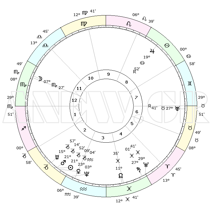 | | ΘΕΣΕΙΣ ΠΛΑΝΗΤΩΝ ΑΣΤΡΟΛΟΓΙΚΟΥ ΧΑΡΤΗ ΤΗΣ ΣΤΙΓΜΗΣ ΑΥΤΗΣ | | | | Πλανήτης | Ζώδιο | Μοίρες | Δεκαήμ. | Σε οίκο | Απόκλιση | | Ακμές των οίκων | | Ηλιος | Αιγόκερως | 21°48' | Τρίτο | 3 | 21 S 40 | | 1ος | 10°07' | Σκορπιός | | Σελήνη | Σκορπιός | 06°39' | Πρώτο | 12 | 17 S 45 | | 2ος | 09°12' | Τοξότης | | Ερμής | Αιγόκερως | 15°50' | Δεύτερο | 3 | 24 S 04 | | 3ος | 12°06' | Αιγόκερως | | Αφροδίτη | Αιγόκερως | 23°04' | Τρίτο | 3 | 22 S 20 | | 4ος | 17°02' | Υδροχόος | | Αρης | Αιγόκερως | 21°11' | Τρίτο | 3 | 22 S 43 | | 5ος | 19°41' | Ιχθείς | | Δίας | Καρκίνος | 19°53'R | Δεύτερο | 9 | 22 N 13 | | 6ος | 17°19' | Κριός | | Κρόνος | Ιχθείς | 27°01' | Τρίτο | 5 | 03 S 14 | | 7ος | 10°07' | Ταύρος | | Ουρανός | Ταύρος | 27°41'R | Τρίτο | 7 | 19 N 27 | | 8ος | 09°12' | Δίδυμοι | | Ποσειδώνας | Ιχθείς | 29°41' | Τρίτο | 5 | 01 S 21 | | 9ος | 12°06' | Καρκίνος | | Πλούτωνας | Υδροχόος | 03°04' | Πρώτο | 3 | 23 S 09 | | 10ος | 17°02' | Λέων | | Β. Δεσμός | Ιχθείς | 11°35' | Δεύτερο | 4 | 07 S 13 | | 11ος | 19°41' | Παρθένος | | Ωροσκόπος | Σκορπιός | 10°07' | Δεύτερο | | | 12ος | 17°19' | Ζυγός | | Μεσουράνημα | Λέων | 17°02' | Δεύτερο | | | |