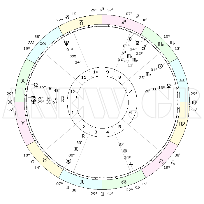| | ΘΕΣΕΙΣ ΠΛΑΝΗΤΩΝ ΑΣΤΡΟΛΟΓΙΚΟΥ ΧΑΡΤΗ ΤΗΣ ΣΤΙΓΜΗΣ ΑΥΤΗΣ | | | | Πλανήτης | Ζώδιο | Μοίρες | Δεκαήμ. | Σε οίκο | Απόκλιση | | Ακμές των οίκων | | Ηλιος | Σκορπιός | 01°20' | Πρώτο | 9 | 11 S 56 | | 1ος | 07°01' | Υδροχόος | | Σελήνη | Τοξότης | 03°42' | Πρώτο | 10 | 25 S 47 | | 2ος | 22°06' | Ιχθείς | | Ερμής | Σκορπιός | 24°28' | Τρίτο | 9 | 21 S 24 | | 3ος | 29°20' | Κριός | | Αφροδίτη | Ζυγός | 13°12' | Δεύτερο | 8 | 03 S 48 | | 4ος | 26°39' | Ταύρος | | Αρης | Σκορπιός | 22°09' | Τρίτο | 9 | 18 S 37 | | 5ος | 18°58' | Δίδυμοι | | Δίας | Καρκίνος | 24°37' | Τρίτο | 6 | 21 N 16 | | 6ος | 10°42' | Καρκίνος | | Κρόνος | Ιχθείς | 26°18'R | Τρίτο | 2 | 03 S 45 | | 7ος | 07°01' | Λέων | | Ουρανός | Δίδυμοι | 00°33'R | Πρώτο | 4 | 20 N 03 | | 8ος | 22°06' | Παρθένος | | Ποσειδώνας | Ιχθείς | 29°57'R | Τρίτο | 2 | 01 S 17 | | 9ος | 29°20' | Ζυγός | | Πλούτωνας | Υδροχόος | 01°24' | Πρώτο | 12 | 23 S 32 | | 10ος | 26°39' | Σκορπιός | | Β. Δεσμός | Ιχθείς | 15°48' | Δεύτερο | 1 | 05 S 36 | | 11ος | 18°58' | Τοξότης | | Ωροσκόπος | Υδροχόος | 07°01' | Πρώτο | | | 12ος | 10°42' | Αιγόκερως | | Μεσουράνημα | Σκορπιός | 26°39' | Τρίτο | | | |