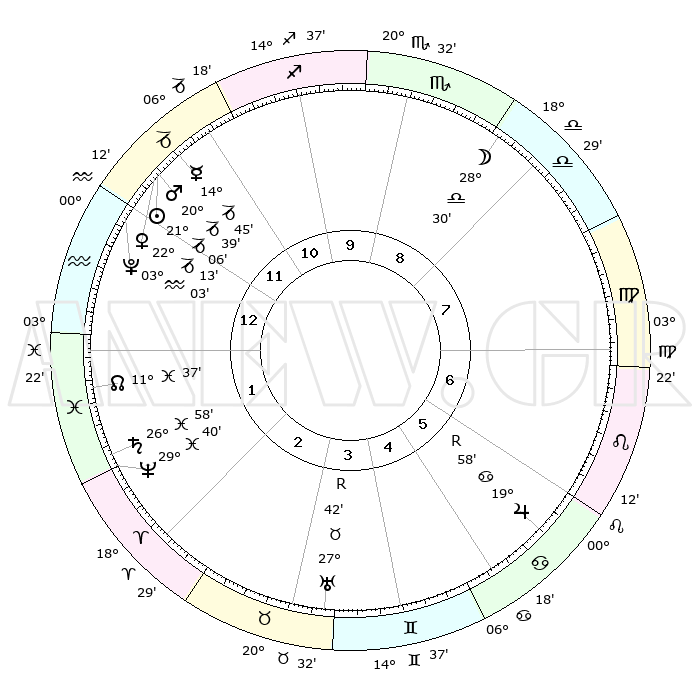 | | ΘΕΣΕΙΣ ΠΛΑΝΗΤΩΝ ΑΣΤΡΟΛΟΓΙΚΟΥ ΧΑΡΤΗ ΤΗΣ ΣΤΙΓΜΗΣ ΑΥΤΗΣ | | | | Πλανήτης | Ζώδιο | Μοίρες | Δεκαήμ. | Σε οίκο | Απόκλιση | | Ακμές των οίκων | | Ηλιος | Αιγόκερως | 20°39' | Τρίτο | 4 | 21 S 51 | | 1ος | 03°59' | Ζυγός | | Σελήνη | Ζυγός | 23°13' | Τρίτο | 1 | 12 S 16 | | 2ος | 00°51' | Σκορπιός | | Ερμής | Αιγόκερως | 14°03' | Δεύτερο | 4 | 24 S 11 | | 3ος | 01°26' | Τοξότης | | Αφροδίτη | Αιγόκερως | 21°40' | Τρίτο | 4 | 22 S 32 | | 4ος | 04°28' | Αιγόκερως | | Αρης | Αιγόκερως | 20°19' | Τρίτο | 4 | 22 S 50 | | 5ος | 07°25' | Υδροχόος | | Δίας | Καρκίνος | 20°02'R | Τρίτο | 10 | 22 N 12 | | 6ος | 07°41' | Ιχθείς | | Κρόνος | Ιχθείς | 26°56' | Τρίτο | 6 | 03 S 16 | | 7ος | 03°59' | Κριός | | Ουρανός | Ταύρος | 27°42'R | Τρίτο | 8 | 19 N 27 | | 8ος | 00°51' | Ταύρος | | Ποσειδώνας | Ιχθείς | 29°39' | Τρίτο | 6 | 01 S 21 | | 9ος | 01°26' | Δίδυμοι | | Πλούτωνας | Υδροχόος | 03°02' | Πρώτο | 4 | 23 S 09 | | 10ος | 04°28' | Καρκίνος | | Β. Δεσμός | Ιχθείς | 11°39' | Δεύτερο | 6 | 07 S 12 | | 11ος | 07°25' | Λέων | | Ωροσκόπος | Ζυγός | 03°59' | Πρώτο | | | 12ος | 07°41' | Παρθένος | | Μεσουράνημα | Καρκίνος | 04°28' | Πρώτο | | | |