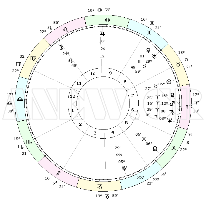 | | ΘΕΣΕΙΣ ΠΛΑΝΗΤΩΝ ΑΣΤΡΟΛΟΓΙΚΟΥ ΧΑΡΤΗ ΤΗΣ ΣΤΙΓΜΗΣ ΑΥΤΗΣ | | | | Πλανήτης | Ζώδιο | Μοίρες | Δεκαήμ. | Σε οίκο | Απόκλιση | | Ακμές των οίκων | | Ηλιος | Ταύρος | 05°23' | Πρώτο | 8 | 13 N 19 | | 1ος | 28°25' | Παρθένος | | Σελήνη | Λέων | 23°56' | Τρίτο | 11 | 14 N 40 | | 2ος | 24°53' | Ζυγός | | Ερμής | Κριός | 16°18' | Δεύτερο | 7 | 04 N 12 | | 3ος | 25°16' | Σκορπιός | | Αφροδίτη | Δίδυμοι | 01°44' | Πρώτο | 9 | 21 N 09 | | 4ος | 28°13' | Τοξότης | | Αρης | Κριός | 12°13' | Δεύτερο | 7 | 03 N 59 | | 5ος | 01°13' | Υδροχόος | | Δίας | Καρκίνος | 18°12' | Δεύτερο | 10 | 22 N 35 | | 6ος | 01°43' | Ιχθείς | | Κρόνος | Κριός | 08°38' | Πρώτο | 7 | 01 N 26 | | 7ος | 28°25' | Ιχθείς | | Ουρανός | Ταύρος | 29°59' | Τρίτο | 9 | 19 N 59 | | 8ος | 24°53' | Κριός | | Ποσειδώνας | Κριός | 03°05' | Πρώτο | 7 | 00 N 01 | | 9ος | 25°16' | Ταύρος | | Πλούτωνας | Υδροχόος | 05°29' | Πρώτο | 5 | 22 S 48 | | 10ος | 28°13' | Δίδυμοι | | Β. Δεσμός | Ιχθείς | 06°06' | Πρώτο | 6 | 09 S 16 | | 11ος | 01°13' | Λέων | | Ωροσκόπος | Παρθένος | 28°25' | Τρίτο | | | 12ος | 01°43' | Παρθένος | | Μεσουράνημα | Δίδυμοι | 28°13' | Τρίτο | | | |