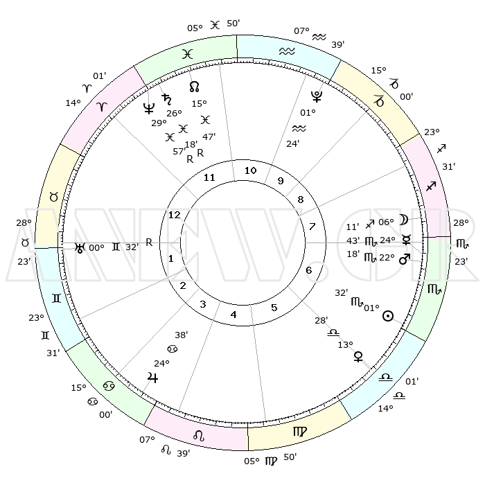 | | ΘΕΣΕΙΣ ΠΛΑΝΗΤΩΝ ΑΣΤΡΟΛΟΓΙΚΟΥ ΧΑΡΤΗ ΤΗΣ ΣΤΙΓΜΗΣ ΑΥΤΗΣ | | | | Πλανήτης | Ζώδιο | Μοίρες | Δεκαήμ. | Σε οίκο | Απόκλιση | | Ακμές των οίκων | | Ηλιος | Σκορπιός | 01°03' | Πρώτο | 12 | 11 S 50 | | 1ος | 05°35' | Σκορπιός | | Σελήνη | Τοξότης | 00°24' | Πρώτο | 1 | 25 S 01 | | 2ος | 04°20' | Τοξότης | | Ερμής | Σκορπιός | 24°08' | Τρίτο | 1 | 21 S 17 | | 3ος | 06°47' | Αιγόκερως | | Αφροδίτη | Ζυγός | 12°51' | Δεύτερο | 12 | 03 S 40 | | 4ος | 11°22' | Υδροχόος | | Αρης | Σκορπιός | 21°57' | Τρίτο | 1 | 18 S 33 | | 5ος | 14°11' | Ιχθείς | | Δίας | Καρκίνος | 24°36' | Τρίτο | 9 | 21 N 16 | | 6ος | 12°19' | Κριός | | Κρόνος | Ιχθείς | 26°19'R | Τρίτο | 5 | 03 S 45 | | 7ος | 05°35' | Ταύρος | | Ουρανός | Δίδυμοι | 00°33'R | Πρώτο | 7 | 20 N 03 | | 8ος | 04°20' | Δίδυμοι | | Ποσειδώνας | Ιχθείς | 29°57'R | Τρίτο | 5 | 01 S 17 | | 9ος | 06°47' | Καρκίνος | | Πλούτωνας | Υδροχόος | 01°23' | Πρώτο | 3 | 23 S 32 | | 10ος | 11°22' | Λέων | | Β. Δεσμός | Ιχθείς | 15°49' | Δεύτερο | 5 | 05 S 36 | | 11ος | 14°11' | Παρθένος | | Ωροσκόπος | Σκορπιός | 05°35' | Πρώτο | | | 12ος | 12°19' | Ζυγός | | Μεσουράνημα | Λέων | 11°22' | Δεύτερο | | | |