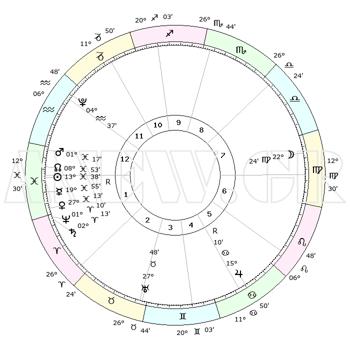 | | ΘΕΣΕΙΣ ΠΛΑΝΗΤΩΝ ΑΣΤΡΟΛΟΓΙΚΟΥ ΧΑΡΤΗ ΤΗΣ ΣΤΙΓΜΗΣ ΑΥΤΗΣ | | | | Πλανήτης | Ζώδιο | Μοίρες | Δεκαήμ. | Σε οίκο | Απόκλιση | | Ακμές των οίκων | | Ηλιος | Ιχθείς | 13°34' | Δεύτερο | 1 | 06 S 28 | | 1ος | 12°31' | Υδροχόος | | Σελήνη | Παρθένος | 21°39' | Τρίτο | 7 | 02 N 15 | | 2ος | 28°05' | Ιχθείς | | Ερμής | Ιχθείς | 19°58'R | Δεύτερο | 1 | 00 S 37 | | 3ος | 04°17' | Ταύρος | | Αφροδίτη | Ιχθείς | 27°09' | Τρίτο | 1 | 02 S 20 | | 4ος | 00°46' | Δίδυμοι | | Αρης | Ιχθείς | 01°14' | Πρώτο | 1 | 12 S 03 | | 5ος | 22°50' | Δίδυμοι | | Δίας | Καρκίνος | 15°10'R | Δεύτερο | 6 | 22 N 55 | | 6ος | 14°54' | Καρκίνος | | Κρόνος | Κριός | 02°13' | Πρώτο | 2 | 01 S 04 | | 7ος | 12°31' | Λέων | | Ουρανός | Ταύρος | 27°48' | Τρίτο | 3 | 19 N 29 | | 8ος | 28°05' | Παρθένος | | Ποσειδώνας | Κριός | 01°10' | Πρώτο | 2 | 00 S 44 | | 9ος | 04°17' | Σκορπιός | | Πλούτωνας | Υδροχόος | 04°37' | Πρώτο | 12 | 22 S 52 | | 10ος | 00°47' | Τοξότης | | Β. Δεσμός | Ιχθείς | 08°53' | Πρώτο | 1 | 08 S 14 | | 11ος | 22°50' | Τοξότης | | Ωροσκόπος | Υδροχόος | 12°31' | Δεύτερο | | | 12ος | 14°54' | Αιγόκερως | | Μεσουράνημα | Τοξότης | 00°47' | Πρώτο | | | |