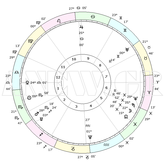 | | ΘΕΣΕΙΣ ΠΛΑΝΗΤΩΝ ΑΣΤΡΟΛΟΓΙΚΟΥ ΧΑΡΤΗ ΤΗΣ ΣΤΙΓΜΗΣ ΑΥΤΗΣ | | | | Πλανήτης | Ζώδιο | Μοίρες | Δεκαήμ. | Σε οίκο | Απόκλιση | | Ακμές των οίκων | | Ηλιος | Σκορπιός | 09°19' | Πρώτο | 8 | 14 S 36 | | 1ος | 23°19' | Υδροχόος | | Σελήνη | Ιχθείς | 13°47' | Δεύτερο | 1 | 06 S 39 | | 2ος | 09°05' | Κριός | | Ερμής | Τοξότης | 02°52' | Πρώτο | 9 | 23 S 34 | | 3ος | 13°08' | Ταύρος | | Αφροδίτη | Ζυγός | 23°12' | Τρίτο | 8 | 07 S 39 | | 4ος | 08°15' | Δίδυμοι | | Αρης | Σκορπιός | 27°50' | Τρίτο | 9 | 20 S 04 | | 5ος | 29°60' | Δίδυμοι | | Δίας | Καρκίνος | 24°59' | Τρίτο | 6 | 21 N 13 | | 6ος | 22°55' | Καρκίνος | | Κρόνος | Ιχθείς | 25°54'R | Τρίτο | 1 | 03 S 53 | | 7ος | 23°19' | Λέων | | Ουρανός | Δίδυμοι | 00°15'R | Πρώτο | 3 | 20 N 00 | | 8ος | 09°05' | Ζυγός | | Ποσειδώνας | Ιχθείς | 29°47'R | Τρίτο | 1 | 01 S 21 | | 9ος | 13°08' | Σκορπιός | | Πλούτωνας | Υδροχόος | 01°27' | Πρώτο | 12 | 23 S 31 | | 10ος | 08°15' | Τοξότης | | Β. Δεσμός | Ιχθείς | 15°22' | Δεύτερο | 1 | 05 S 46 | | 11ος | 29°60' | Τοξότης | | Ωροσκόπος | Υδροχόος | 23°19' | Τρίτο | | | 12ος | 22°55' | Αιγόκερως | | Μεσουράνημα | Τοξότης | 08°15' | Πρώτο | | | |