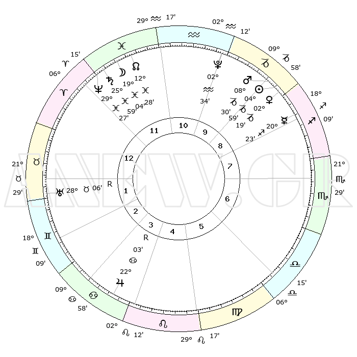 | | ΘΕΣΕΙΣ ΠΛΑΝΗΤΩΝ ΑΣΤΡΟΛΟΓΙΚΟΥ ΧΑΡΤΗ ΤΗΣ ΣΤΙΓΜΗΣ ΑΥΤΗΣ | | | | Πλανήτης | Ζώδιο | Μοίρες | Δεκαήμ. | Σε οίκο | Απόκλιση | | Ακμές των οίκων | | Ηλιος | Αιγόκερως | 04°54' | Πρώτο | 10 | 23 S 21 | | 1ος | 05°56' | Κριός | | Σελήνη | Ιχθείς | 17°57' | Δεύτερο | 12 | 04 S 13 | | 2ος | 14°44' | Ταύρος | | Ερμής | Τοξότης | 20°16' | Τρίτο | 9 | 23 S 00 | | 3ος | 11°16' | Δίδυμοι | | Αφροδίτη | Αιγόκερως | 02°13' | Πρώτο | 9 | 23 S 42 | | 4ος | 03°20' | Καρκίνος | | Αρης | Αιγόκερως | 08°26' | Πρώτο | 10 | 24 S 01 | | 5ος | 25°56' | Καρκίνος | | Δίας | Καρκίνος | 22°04'R | Τρίτο | 4 | 21 N 51 | | 6ος | 24°16' | Λέων | | Κρόνος | Ιχθείς | 25°59' | Τρίτο | 12 | 03 S 41 | | 7ος | 05°56' | Ζυγός | | Ουρανός | Ταύρος | 28°06'R | Τρίτο | 2 | 19 N 32 | | 8ος | 14°44' | Σκορπιός | | Ποσειδώνας | Ιχθείς | 29°27' | Τρίτο | 12 | 01 S 27 | | 9ος | 11°16' | Τοξότης | | Πλούτωνας | Υδροχόος | 02°33' | Πρώτο | 11 | 23 S 15 | | 10ος | 03°20' | Αιγόκερως | | Β. Δεσμός | Ιχθείς | 12°28' | Δεύτερο | 12 | 06 S 53 | | 11ος | 25°56' | Αιγόκερως | | Ωροσκόπος | Κριός | 05°56' | Πρώτο | | | 12ος | 24°16' | Υδροχόος | | Μεσουράνημα | Αιγόκερως | 03°20' | Πρώτο | | | |