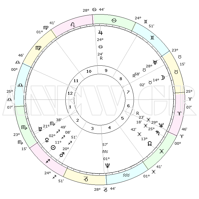 | | ΘΕΣΕΙΣ ΠΛΑΝΗΤΩΝ ΑΣΤΡΟΛΟΓΙΚΟΥ ΧΑΡΤΗ ΤΗΣ ΣΤΙΓΜΗΣ ΑΥΤΗΣ | | | | Πλανήτης | Ζώδιο | Μοίρες | Δεκαήμ. | Σε οίκο | Απόκλιση | | Ακμές των οίκων | | Ηλιος | Τοξότης | 11°07' | Δεύτερο | 2 | 22 S 06 | | 1ος | 19°38' | Ζυγός | | Σελήνη | Ταύρος | 13°45' | Δεύτερο | 7 | 20 N 05 | | 2ος | 17°27' | Σκορπιός | | Ερμής | Σκορπιός | 21°37' | Τρίτο | 2 | 15 S 39 | | 3ος | 18°44' | Τοξότης | | Αφροδίτη | Τοξότης | 02°47' | Πρώτο | 2 | 20 S 06 | | 4ος | 22°18' | Αιγόκερως | | Αρης | Τοξότης | 20°50' | Τρίτο | 3 | 23 S 48 | | 5ος | 25°15' | Υδροχόος | | Δίας | Καρκίνος | 24°24'R | Τρίτο | 10 | 21 N 24 | | 6ος | 24°44' | Ιχθείς | | Κρόνος | Ιχθείς | 25°18' | Τρίτο | 6 | 04 S 02 | | 7ος | 19°38' | Κριός | | Ουρανός | Ταύρος | 28°58'R | Τρίτο | 8 | 19 N 43 | | 8ος | 17°27' | Ταύρος | | Ποσειδώνας | Ιχθείς | 29°23'R | Τρίτο | 6 | 01 S 29 | | 9ος | 18°44' | Δίδυμοι | | Πλούτωνας | Υδροχόος | 01°57' | Πρώτο | 4 | 23 S 23 | | 10ος | 22°18' | Καρκίνος | | Β. Δεσμός | Ιχθείς | 13°42' | Δεύτερο | 5 | 06 S 24 | | 11ος | 25°15' | Λέων | | Ωροσκόπος | Ζυγός | 19°38' | Δεύτερο | | | 12ος | 24°44' | Παρθένος | | Μεσουράνημα | Καρκίνος | 22°18' | Τρίτο | | | |
