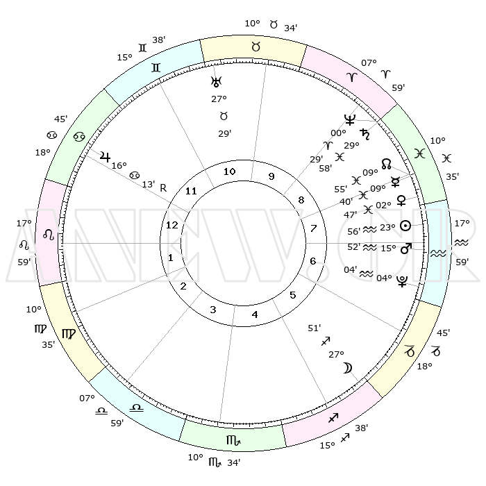 | | ΘΕΣΕΙΣ ΠΛΑΝΗΤΩΝ ΑΣΤΡΟΛΟΓΙΚΟΥ ΧΑΡΤΗ ΤΗΣ ΣΤΙΓΜΗΣ ΑΥΤΗΣ | | | | Πλανήτης | Ζώδιο | Μοίρες | Δεκαήμ. | Σε οίκο | Απόκλιση | | Ακμές των οίκων | | Ηλιος | Υδροχόος | 23°52' | Τρίτο | 8 | 13 S 34 | | 1ος | 29°26' | Καρκίνος | | Σελήνη | Τοξότης | 27°04' | Τρίτο | 5 | 28 S 24 | | 2ος | 20°26' | Λέων | | Ερμής | Ιχθείς | 09°34' | Πρώτο | 8 | 08 S 24 | | 3ος | 15°25' | Παρθένος | | Αφροδίτη | Ιχθείς | 02°42' | Πρώτο | 8 | 11 S 52 | | 4ος | 16°23' | Ζυγός | | Αρης | Υδροχόος | 15°49' | Δεύτερο | 7 | 17 S 07 | | 5ος | 22°26' | Σκορπιός | | Δίας | Καρκίνος | 16°13'R | Δεύτερο | 12 | 22 N 46 | | 6ος | 28°14' | Τοξότης | | Κρόνος | Ιχθείς | 29°58' | Τρίτο | 9 | 01 S 59 | | 7ος | 29°26' | Αιγόκερως | | Ουρανός | Ταύρος | 27°29' | Τρίτο | 11 | 19 N 25 | | 8ος | 20°26' | Υδροχόος | | Ποσειδώνας | Κριός | 00°29' | Πρώτο | 9 | 01 S 00 | | 9ος | 15°25' | Ιχθείς | | Πλούτωνας | Υδροχόος | 04°04' | Πρώτο | 7 | 22 S 57 | | 10ος | 16°23' | Κριός | | Β. Δεσμός | Ιχθείς | 09°55' | Πρώτο | 8 | 07 S 51 | | 11ος | 22°26' | Ταύρος | | Ωροσκόπος | Καρκίνος | 29°26' | Τρίτο | | | 12ος | 28°14' | Δίδυμοι | | Μεσουράνημα | Κριός | 16°23' | Δεύτερο | | | |