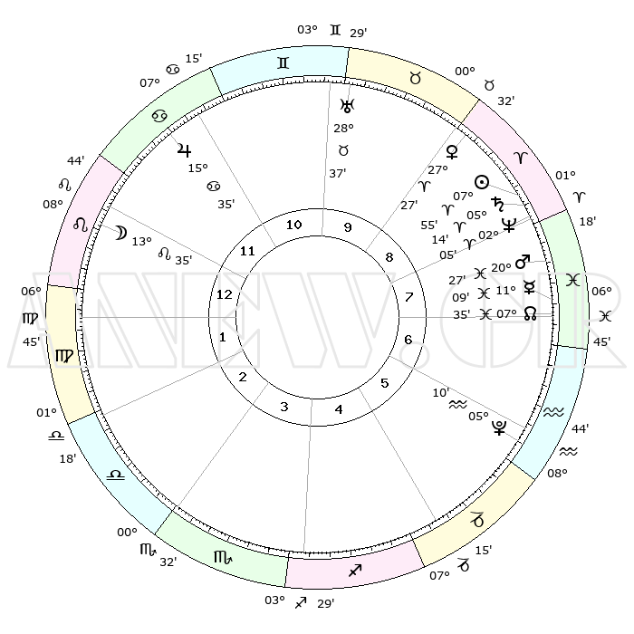 | | ΘΕΣΕΙΣ ΠΛΑΝΗΤΩΝ ΑΣΤΡΟΛΟΓΙΚΟΥ ΧΑΡΤΗ ΤΗΣ ΣΤΙΓΜΗΣ ΑΥΤΗΣ | | | | Πλανήτης | Ζώδιο | Μοίρες | Δεκαήμ. | Σε οίκο | Απόκλιση | | Ακμές των οίκων | | Ηλιος | Κριός | 07°48' | Πρώτο | 9 | 03 N 06 | | 1ος | 04°42' | Λέων | | Σελήνη | Λέων | 12°05' | Δεύτερο | 1 | 19 N 25 | | 2ος | 26°05' | Λέων | | Ερμής | Ιχθείς | 11°05' | Δεύτερο | 8 | 08 S 03 | | 3ος | 21°47' | Παρθένος | | Αφροδίτη | Κριός | 27°19' | Τρίτο | 10 | 09 N 58 | | 4ος | 23°21' | Ζυγός | | Αρης | Ιχθείς | 20°22' | Τρίτο | 8 | 04 S 47 | | 5ος | 29°14' | Σκορπιός | | Δίας | Καρκίνος | 15°34' | Δεύτερο | 12 | 22 N 53 | | 6ος | 04°11' | Αιγόκερως | | Κρόνος | Κριός | 05°13' | Πρώτο | 9 | 00 N 07 | | 7ος | 04°42' | Υδροχόος | | Ουρανός | Ταύρος | 28°37' | Τρίτο | 10 | 19 N 41 | | 8ος | 26°05' | Υδροχόος | | Ποσειδώνας | Κριός | 02°05' | Πρώτο | 9 | 00 S 22 | | 9ος | 21°47' | Ιχθείς | | Πλούτωνας | Υδροχόος | 05°09' | Πρώτο | 7 | 22 S 48 | | 10ος | 23°21' | Κριός | | Β. Δεσμός | Ιχθείς | 07°35' | Πρώτο | 8 | 08 S 43 | | 11ος | 29°14' | Ταύρος | | Ωροσκόπος | Λέων | 04°42' | Πρώτο | | | 12ος | 04°11' | Καρκίνος | | Μεσουράνημα | Κριός | 23°21' | Τρίτο | | | |