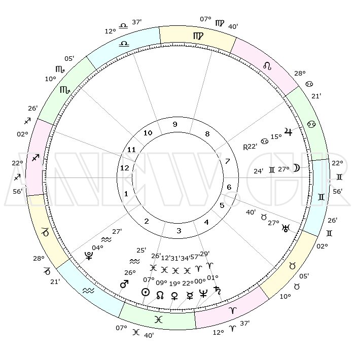 | | ΘΕΣΕΙΣ ΠΛΑΝΗΤΩΝ ΑΣΤΡΟΛΟΓΙΚΟΥ ΧΑΡΤΗ ΤΗΣ ΣΤΙΓΜΗΣ ΑΥΤΗΣ | | | | Πλανήτης | Ζώδιο | Μοίρες | Δεκαήμ. | Σε οίκο | Απόκλιση | | Ακμές των οίκων | | Ηλιος | Ιχθείς | 07°55' | Πρώτο | 8 | 08 S 36 | | 1ος | 23°31' | Καρκίνος | | Σελήνη | Καρκίνος | 04°20' | Πρώτο | 12 | 28 N 08 | | 2ος | 14°11' | Λέων | | Ερμής | Ιχθείς | 22°34'R | Τρίτο | 9 | 00 S 21 | | 3ος | 08°23' | Παρθένος | | Αφροδίτη | Ιχθείς | 20°08' | Τρίτο | 9 | 05 S 11 | | 4ος | 08°32' | Ζυγός | | Αρης | Υδροχόος | 26°48' | Τρίτο | 8 | 13 S 36 | | 5ος | 14°36' | Σκορπιός | | Δίας | Καρκίνος | 15°21'R | Δεύτερο | 12 | 22 N 53 | | 6ος | 21°24' | Τοξότης | | Κρόνος | Κριός | 01°33' | Πρώτο | 9 | 01 S 21 | | 7ος | 23°31' | Αιγόκερως | | Ουρανός | Ταύρος | 27°41' | Τρίτο | 11 | 19 N 28 | | 8ος | 14°11' | Υδροχόος | | Ποσειδώνας | Κριός | 00°58' | Πρώτο | 9 | 00 S 49 | | 9ος | 08°23' | Ιχθείς | | Πλούτωνας | Υδροχόος | 04°28' | Πρώτο | 7 | 22 S 53 | | 10ος | 08°32' | Κριός | | Β. Δεσμός | Ιχθείς | 09°11' | Πρώτο | 9 | 08 S 08 | | 11ος | 14°36' | Ταύρος | | Ωροσκόπος | Καρκίνος | 23°31' | Τρίτο | | | 12ος | 21°24' | Δίδυμοι | | Μεσουράνημα | Κριός | 08°32' | Πρώτο | | | |