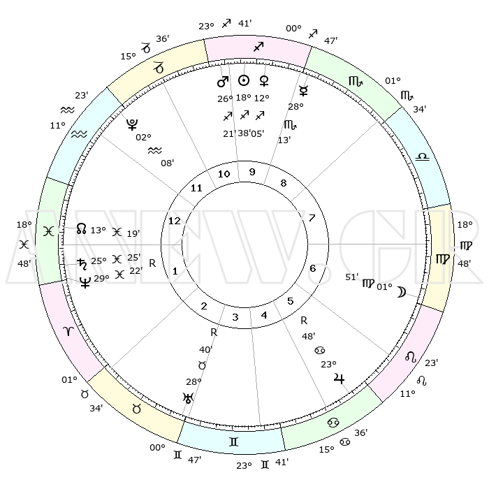 | | ΘΕΣΕΙΣ ΠΛΑΝΗΤΩΝ ΑΣΤΡΟΛΟΓΙΚΟΥ ΧΑΡΤΗ ΤΗΣ ΣΤΙΓΜΗΣ ΑΥΤΗΣ | | | | Πλανήτης | Ζώδιο | Μοίρες | Δεκαήμ. | Σε οίκο | Απόκλιση | | Ακμές των οίκων | | Ηλιος | Τοξότης | 18°35' | Δεύτερο | 10 | 22 S 57 | | 1ος | 27°48' | Υδροχόος | | Σελήνη | Παρθένος | 01°21' | Πρώτο | 7 | 11 N 57 | | 2ος | 13°23' | Κριός | | Ερμής | Σκορπιός | 28°10' | Τρίτο | 9 | 17 S 43 | | 3ος | 16°32' | Ταύρος | | Αφροδίτη | Τοξότης | 12°03' | Δεύτερο | 10 | 21 S 53 | | 4ος | 11°09' | Δίδυμοι | | Αρης | Τοξότης | 26°19' | Τρίτο | 10 | 24 S 07 | | 5ος | 02°51' | Καρκίνος | | Δίας | Καρκίνος | 23°48'R | Τρίτο | 5 | 21 N 31 | | 6ος | 26°11' | Καρκίνος | | Κρόνος | Ιχθείς | 25°25' | Τρίτο | 1 | 03 S 58 | | 7ος | 27°48' | Λέων | | Ουρανός | Ταύρος | 28°40'R | Τρίτο | 3 | 19 N 40 | | 8ος | 13°23' | Ζυγός | | Ποσειδώνας | Ιχθείς | 29°22'R | Τρίτο | 1 | 01 S 29 | | 9ος | 16°32' | Σκορπιός | | Πλούτωνας | Υδροχόος | 02°07' | Πρώτο | 12 | 23 S 21 | | 10ος | 11°09' | Τοξότης | | Β. Δεσμός | Ιχθείς | 13°19' | Δεύτερο | 1 | 06 S 33 | | 11ος | 02°51' | Αιγόκερως | | Ωροσκόπος | Υδροχόος | 27°48' | Τρίτο | | | 12ος | 26°11' | Αιγόκερως | | Μεσουράνημα | Τοξότης | 11°09' | Δεύτερο | | | |