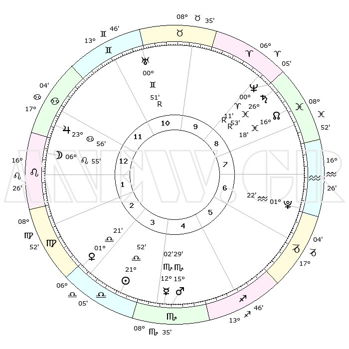 | ΘΕΣΕΙΣ ΠΛΑΝΗΤΩΝ ΑΣΤΡΟΛΟΓΙΚΟΥ ΧΑΡΤΗ ΤΗΣ ΣΤΙΓΜΗΣ ΑΥΤΗΣ | | Πλανήτης | Ζώδιο | Μοίρες | Δεκαήμ. | Σε οίκο | Απόκλιση | | Ακμές των οίκων | Ηλιος | Ζυγός | 21°41' | Τρίτο | 5 | 08 S 27 | | 1ος | 20°46' | Δίδυμοι | Σελήνη | Λέων | 04°31' | Πρώτο | 3 | 22 N 37 | | 2ος | 12°20' | Καρκίνος | Ερμής | Σκορπιός | 11°46' | Δεύτερο | 6 | 16 S 59 | | 3ος | 03°41' | Λέων | Αφροδίτη | Ζυγός | 01°08' | Πρώτο | 5 | 00 N 56 | | 4ος | 28°38' | Λέων | Αρης | Σκορπιός | 15°22' | Δεύτερο | 6 | 16 S 39 | | 5ος | 00°58' | Ζυγός | Δίας | Καρκίνος | 23°55' | Τρίτο | 2 | 21 N 22 | | 6ος | 11°16' | Σκορπιός | Κρόνος | Ιχθείς | 26°54'R | Τρίτο | 10 | 03 S 32 | | 7ος | 20°46' | Τοξότης | Ουρανός | Δίδυμοι | 00°52'R | Πρώτο | 12 | 20 N 07 | | 8ος | 12°20' | Αιγόκερως | Ποσειδώνας | Κριός | 00°11'R | Πρώτο | 10 | 01 S 11 | | 9ος | 03°41' | Υδροχόος | Πλούτωνας | Υδροχόος | 01°22' | Πρώτο | 8 | 23 S 32 | | 10ος | 28°38' | Υδροχόος | Β. Δεσμός | Ιχθείς | 16°19' | Δεύτερο | 10 | 05 S 24 | | 11ος | 00°58' | Κριός | Ωροσκόπος | Δίδυμοι | 20°46' | Τρίτο | | | 12ος | 11°16' | Ταύρος | Μεσουράνημα | Υδροχόος | 28°38' | Τρίτο | | | |