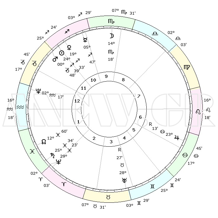 | | ΘΕΣΕΙΣ ΠΛΑΝΗΤΩΝ ΑΣΤΡΟΛΟΓΙΚΟΥ ΧΑΡΤΗ ΤΗΣ ΣΤΙΓΜΗΣ ΑΥΤΗΣ | | | | Πλανήτης | Ζώδιο | Μοίρες | Δεκαήμ. | Σε οίκο | Απόκλιση | | Ακμές των οίκων | | Ηλιος | Τοξότης | 23°42' | Τρίτο | 10 | 23 S 17 | | 1ος | 17°52' | Ιχθείς | | Σελήνη | Σκορπιός | 03°11' | Πρώτο | 8 | 16 S 12 | | 2ος | 00°48' | Ταύρος | | Ερμής | Τοξότης | 04°30' | Πρώτο | 9 | 19 S 35 | | 3ος | 00°11' | Δίδυμοι | | Αφροδίτη | Τοξότης | 18°22' | Δεύτερο | 9 | 22 S 47 | | 4ος | 23°09' | Δίδυμοι | | Αρης | Αιγόκερως | 00°06' | Πρώτο | 10 | 24 S 13 | | 5ος | 15°02' | Καρκίνος | | Δίας | Καρκίνος | 23°19'R | Τρίτο | 5 | 21 N 37 | | 6ος | 10°42' | Λέων | | Κρόνος | Ιχθείς | 25°33' | Τρίτο | 1 | 03 S 54 | | 7ος | 17°52' | Παρθένος | | Ουρανός | Ταύρος | 28°29'R | Τρίτο | 2 | 19 N 37 | | 8ος | 00°48' | Σκορπιός | | Ποσειδώνας | Ιχθείς | 29°23' | Τρίτο | 1 | 01 S 29 | | 9ος | 00°11' | Τοξότης | | Πλούτωνας | Υδροχόος | 02°15' | Πρώτο | 11 | 23 S 19 | | 10ος | 23°09' | Τοξότης | | Β. Δεσμός | Ιχθείς | 13°03' | Δεύτερο | 12 | 06 S 40 | | 11ος | 15°02' | Αιγόκερως | | Ωροσκόπος | Ιχθείς | 17°52' | Δεύτερο | | | 12ος | 10°42' | Υδροχόος | | Μεσουράνημα | Τοξότης | 23°09' | Τρίτο | | | |