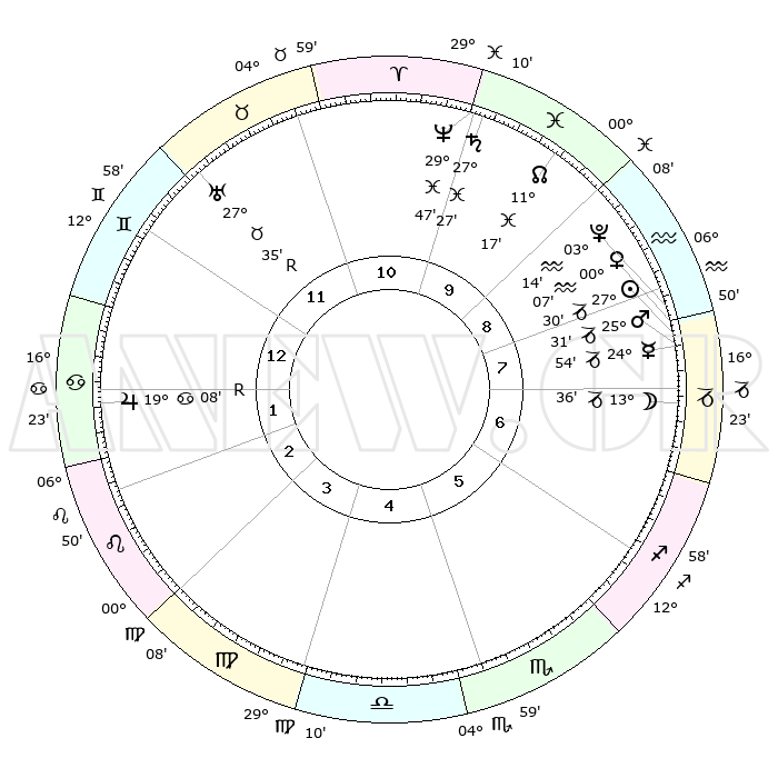 | | ΘΕΣΕΙΣ ΠΛΑΝΗΤΩΝ ΑΣΤΡΟΛΟΓΙΚΟΥ ΧΑΡΤΗ ΤΗΣ ΣΤΙΓΜΗΣ ΑΥΤΗΣ | | | | Πλανήτης | Ζώδιο | Μοίρες | Δεκαήμ. | Σε οίκο | Απόκλιση | | Ακμές των οίκων | | Ηλιος | Αιγόκερως | 27°25' | Τρίτο | 8 | 20 S 40 | | 1ος | 22°22' | Δίδυμοι | | Σελήνη | Αιγόκερως | 12°41' | Δεύτερο | 7 | 27 S 07 | | 2ος | 13°46' | Καρκίνος | | Ερμής | Αιγόκερως | 24°46' | Τρίτο | 8 | 23 S 03 | | 3ος | 05°11' | Λέων | | Αφροδίτη | Υδροχόος | 00°01' | Πρώτο | 8 | 21 S 10 | | 4ος | 00°21' | Παρθένος | | Αρης | Αιγόκερως | 25°27' | Τρίτο | 8 | 22 S 01 | | 5ος | 02°58' | Ζυγός | | Δίας | Καρκίνος | 19°08'R | Δεύτερο | 2 | 22 N 20 | | 6ος | 13°16' | Σκορπιός | | Κρόνος | Ιχθείς | 27°27' | Τρίτο | 10 | 03 S 03 | | 7ος | 22°22' | Τοξότης | | Ουρανός | Ταύρος | 27°35'R | Τρίτο | 12 | 19 N 26 | | 8ος | 13°46' | Αιγόκερως | | Ποσειδώνας | Ιχθείς | 29°47' | Τρίτο | 10 | 01 S 18 | | 9ος | 05°11' | Υδροχόος | | Πλούτωνας | Υδροχόος | 03°14' | Πρώτο | 8 | 23 S 07 | | 10ος | 00°21' | Ιχθείς | | Β. Δεσμός | Ιχθείς | 11°18' | Δεύτερο | 10 | 07 S 20 | | 11ος | 02°58' | Κριός | | Ωροσκόπος | Δίδυμοι | 22°22' | Τρίτο | | | 12ος | 13°16' | Ταύρος | | Μεσουράνημα | Ιχθείς | 00°21' | Πρώτο | | | |
