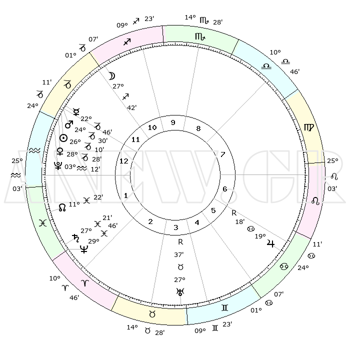 | | ΘΕΣΕΙΣ ΠΛΑΝΗΤΩΝ ΑΣΤΡΟΛΟΓΙΚΟΥ ΧΑΡΤΗ ΤΗΣ ΣΤΙΓΜΗΣ ΑΥΤΗΣ | | | | Πλανήτης | Ζώδιο | Μοίρες | Δεκαήμ. | Σε οίκο | Απόκλιση | | Ακμές των οίκων | | Ηλιος | Αιγόκερως | 26°06' | Τρίτο | 1 | 20 S 55 | | 1ος | 24°36' | Αιγόκερως | | Σελήνη | Τοξότης | 26°54' | Τρίτο | 11 | 28 S 18 | | 2ος | 07°43' | Ιχθείς | | Ερμής | Αιγόκερως | 22°39' | Τρίτο | 12 | 23 S 21 | | 3ος | 16°56' | Κριός | | Αφροδίτη | Αιγόκερως | 28°23' | Τρίτο | 1 | 21 S 28 | | 4ος | 16°21' | Ταύρος | | Αρης | Αιγόκερως | 24°27' | Τρίτο | 12 | 22 S 11 | | 5ος | 09°33' | Δίδυμοι | | Δίας | Καρκίνος | 19°19'R | Δεύτερο | 6 | 22 N 19 | | 6ος | 00°49' | Καρκίνος | | Κρόνος | Ιχθείς | 27°21' | Τρίτο | 2 | 03 S 05 | | 7ος | 24°36' | Καρκίνος | | Ουρανός | Ταύρος | 27°37'R | Τρίτο | 4 | 19 N 26 | | 8ος | 07°43' | Παρθένος | | Ποσειδώνας | Ιχθείς | 29°46' | Τρίτο | 2 | 01 S 19 | | 9ος | 16°56' | Ζυγός | | Πλούτωνας | Υδροχόος | 03°12' | Πρώτο | 1 | 23 S 07 | | 10ος | 16°21' | Σκορπιός | | Β. Δεσμός | Ιχθείς | 11°22' | Δεύτερο | 2 | 07 S 18 | | 11ος | 09°33' | Τοξότης | | Ωροσκόπος | Αιγόκερως | 24°36' | Τρίτο | | | 12ος | 00°49' | Αιγόκερως | | Μεσουράνημα | Σκορπιός | 16°21' | Δεύτερο | | | |