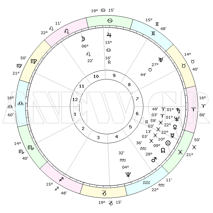 | | ΘΕΣΕΙΣ ΠΛΑΝΗΤΩΝ ΑΣΤΡΟΛΟΓΙΚΟΥ ΧΑΡΤΗ ΤΗΣ ΣΤΙΓΜΗΣ ΑΥΤΗΣ | | | | Πλανήτης | Ζώδιο | Μοίρες | Δεκαήμ. | Σε οίκο | Απόκλιση | | Ακμές των οίκων | | Ηλιος | Ιχθείς | 10°09' | Δεύτερο | 6 | 07 S 46 | | 1ος | 00°01' | Ζυγός | | Σελήνη | Λέων | 05°33' | Πρώτο | 11 | 21 N 42 | | 2ος | 26°36' | Ζυγός | | Ερμής | Ιχθείς | 22°05'R | Τρίτο | 6 | 00 S 09 | | 3ος | 27°03' | Σκορπιός | | Αφροδίτη | Ιχθείς | 22°54' | Τρίτο | 6 | 04 S 04 | | 4ος | 00°01' | Αιγόκερως | | Αρης | Υδροχόος | 28°33' | Τρίτο | 5 | 13 S 00 | | 5ος | 02°60' | Υδροχόος | | Δίας | Καρκίνος | 15°16'R | Δεύτερο | 10 | 22 N 54 | | 6ος | 03°26' | Ιχθείς | | Κρόνος | Κριός | 01°48' | Πρώτο | 7 | 01 S 14 | | 7ος | 00°01' | Κριός | | Ουρανός | Ταύρος | 27°44' | Τρίτο | 9 | 19 N 28 | | 8ος | 26°36' | Κριός | | Ποσειδώνας | Κριός | 01°02' | Πρώτο | 7 | 00 S 47 | | 9ος | 27°03' | Ταύρος | | Πλούτωνας | Υδροχόος | 04°32' | Πρώτο | 5 | 22 S 53 | | 10ος | 00°01' | Καρκίνος | | Β. Δεσμός | Ιχθείς | 09°03' | Πρώτο | 6 | 08 S 10 | | 11ος | 02°60' | Λέων | | Ωροσκόπος | Ζυγός | 00°01' | Πρώτο | | | 12ος | 03°26' | Παρθένος | | Μεσουράνημα | Καρκίνος | 00°01' | Πρώτο | | | |