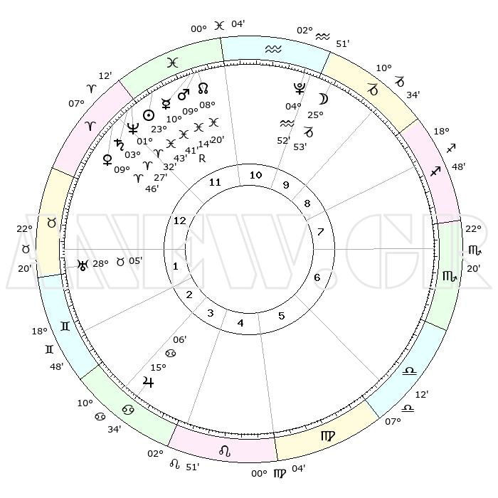 | | ΘΕΣΕΙΣ ΠΛΑΝΗΤΩΝ ΑΣΤΡΟΛΟΓΙΚΟΥ ΧΑΡΤΗ ΤΗΣ ΣΤΙΓΜΗΣ ΑΥΤΗΣ | | | | Πλανήτης | Ζώδιο | Μοίρες | Δεκαήμ. | Σε οίκο | Απόκλιση | | Ακμές των οίκων | | Ηλιος | Ιχθείς | 23°40' | Τρίτο | 12 | 02 S 31 | | 1ος | 19°29' | Κριός | | Σελήνη | Αιγόκερως | 25°06' | Τρίτο | 10 | 24 S 42 | | 2ος | 24°38' | Ταύρος | | Ερμής | Ιχθείς | 10°43'R | Δεύτερο | 12 | 05 S 09 | | 3ος | 19°22' | Δίδυμοι | | Αφροδίτη | Κριός | 09°42' | Πρώτο | 12 | 02 N 51 | | 4ος | 11°06' | Καρκίνος | | Αρης | Ιχθείς | 09°11' | Πρώτο | 12 | 09 S 08 | | 5ος | 04°35' | Λέων | | Δίας | Καρκίνος | 15°06' | Δεύτερο | 4 | 22 N 56 | | 6ος | 05°17' | Παρθένος | | Κρόνος | Κριός | 03°27' | Πρώτο | 12 | 00 S 35 | | 7ος | 19°29' | Ζυγός | | Ουρανός | Ταύρος | 28°05' | Τρίτο | 2 | 19 N 33 | | 8ος | 24°38' | Σκορπιός | | Ποσειδώνας | Κριός | 01°32' | Πρώτο | 12 | 00 S 35 | | 9ος | 19°22' | Τοξότης | | Πλούτωνας | Υδροχόος | 04°52' | Πρώτο | 11 | 22 S 50 | | 10ος | 11°06' | Αιγόκερως | | Β. Δεσμός | Ιχθείς | 08°21' | Πρώτο | 12 | 08 S 26 | | 11ος | 04°35' | Υδροχόος | | Ωροσκόπος | Κριός | 19°29' | Δεύτερο | | | 12ος | 05°17' | Ιχθείς | | Μεσουράνημα | Αιγόκερως | 11°06' | Δεύτερο | | | |