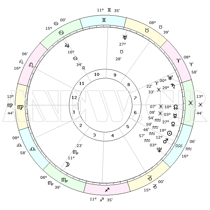 | | ΘΕΣΕΙΣ ΠΛΑΝΗΤΩΝ ΑΣΤΡΟΛΟΓΙΚΟΥ ΧΑΡΤΗ ΤΗΣ ΣΤΙΓΜΗΣ ΑΥΤΗΣ | | | | Πλανήτης | Ζώδιο | Μοίρες | Δεκαήμ. | Σε οίκο | Απόκλιση | | Ακμές των οίκων | | Ηλιος | Υδροχόος | 19°55' | Δεύτερο | 6 | 14 S 50 | | 1ος | 24°29' | Λέων | | Σελήνη | Σκορπιός | 10°35' | Δεύτερο | 3 | 19 S 23 | | 2ος | 17°45' | Παρθένος | | Ερμής | Ιχθείς | 03°01' | Πρώτο | 7 | 11 S 25 | | 3ος | 15°53' | Ζυγός | | Αφροδίτη | Υδροχόος | 27°49' | Τρίτο | 7 | 13 S 35 | | 4ος | 18°42' | Σκορπιός | | Αρης | Υδροχόος | 12°45' | Δεύτερο | 6 | 18 S 00 | | 5ος | 23°17' | Τοξότης | | Δίας | Καρκίνος | 16°34'R | Δεύτερο | 11 | 22 N 43 | | 6ος | 25°43' | Αιγόκερως | | Κρόνος | Ιχθείς | 29°32' | Τρίτο | 8 | 02 S 10 | | 7ος | 24°29' | Υδροχόος | | Ουρανός | Ταύρος | 27°28' | Τρίτο | 10 | 19 N 24 | | 8ος | 17°45' | Ιχθείς | | Ποσειδώνας | Κριός | 00°22' | Πρώτο | 8 | 01 S 03 | | 9ος | 15°53' | Κριός | | Πλούτωνας | Υδροχόος | 03°57' | Πρώτο | 6 | 22 S 59 | | 10ος | 18°42' | Ταύρος | | Β. Δεσμός | Ιχθείς | 10°07' | Δεύτερο | 7 | 07 S 46 | | 11ος | 23°17' | Δίδυμοι | | Ωροσκόπος | Λέων | 24°29' | Τρίτο | | | 12ος | 25°43' | Καρκίνος | | Μεσουράνημα | Ταύρος | 18°42' | Δεύτερο | | | |