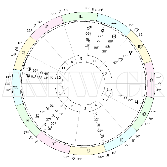 | ΘΕΣΕΙΣ ΠΛΑΝΗΤΩΝ ΑΣΤΡΟΛΟΓΙΚΟΥ ΧΑΡΤΗ ΤΗΣ ΣΤΙΓΜΗΣ ΑΥΤΗΣ | | Πλανήτης | Ζώδιο | Μοίρες | Δεκαήμ. | Σε οίκο | Απόκλιση | | Ακμές των οίκων | Ηλιος | Ζυγός | 08°32' | Πρώτο | 9 | 03 S 23 | | 1ος | 04°35' | Αιγόκερως | Σελήνη | Αιγόκερως | 25°29' | Τρίτο | 1 | 25 S 09 | | 2ος | 12°55' | Υδροχόος | Ερμής | Ζυγός | 21°57' | Τρίτο | 9 | 08 S 42 | | 3ος | 23°09' | Ιχθείς | Αφροδίτη | Παρθένος | 14°40' | Δεύτερο | 8 | 07 N 14 | | 4ος | 26°19' | Κριός | Αρης | Σκορπιός | 06°12' | Πρώτο | 10 | 13 S 40 | | 5ος | 21°56' | Ταύρος | Δίας | Καρκίνος | 22°31' | Τρίτο | 7 | 21 N 34 | | 6ος | 13°28' | Δίδυμοι | Κρόνος | Ιχθείς | 27°51'R | Τρίτο | 3 | 03 S 10 | | 7ος | 04°35' | Καρκίνος | Ουρανός | Δίδυμοι | 01°12'R | Πρώτο | 5 | 20 N 11 | | 8ος | 12°55' | Λέων | Ποσειδώνας | Κριός | 00°32'R | Πρώτο | 3 | 01 S 03 | | 9ος | 23°09' | Παρθένος | Πλούτωνας | Υδροχόος | 01°24'R | Πρώτο | 1 | 23 S 32 | | 10ος | 26°19' | Ζυγός | Β. Δεσμός | Ιχθείς | 17°01' | Δεύτερο | 2 | 05 S 08 | | 11ος | 21°56' | Σκορπιός | Ωροσκόπος | Αιγόκερως | 04°35' | Πρώτο | | | 12ος | 13°28' | Τοξότης | Μεσουράνημα | Ζυγός | 26°19' | Τρίτο | | | |