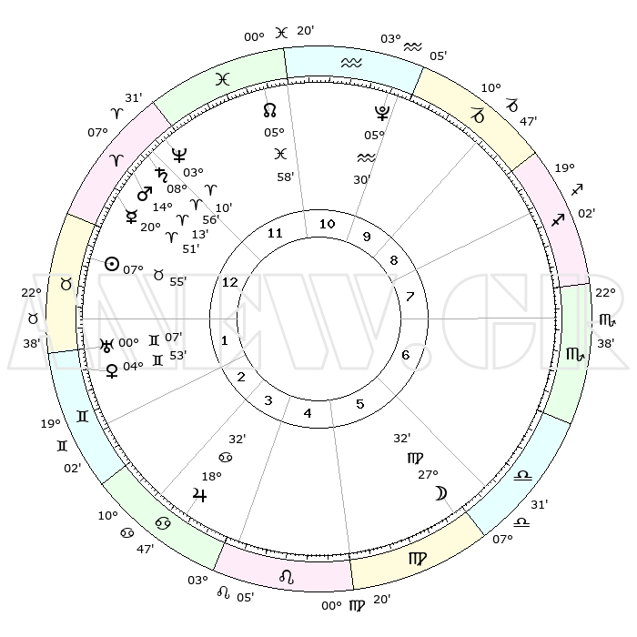 | | ΘΕΣΕΙΣ ΠΛΑΝΗΤΩΝ ΑΣΤΡΟΛΟΓΙΚΟΥ ΧΑΡΤΗ ΤΗΣ ΣΤΙΓΜΗΣ ΑΥΤΗΣ | | | | Πλανήτης | Ζώδιο | Μοίρες | Δεκαήμ. | Σε οίκο | Απόκλιση | | Ακμές των οίκων | | Ηλιος | Ταύρος | 07°51' | Πρώτο | 1 | 14 N 07 | | 1ος | 19°28' | Κριός | | Σελήνη | Παρθένος | 26°43' | Τρίτο | 6 | 00 S 15 | | 2ος | 24°37' | Ταύρος | | Ερμής | Κριός | 20°44' | Τρίτο | 1 | 06 N 03 | | 3ος | 19°21' | Δίδυμοι | | Αφροδίτη | Δίδυμοι | 04°48' | Πρώτο | 2 | 21 N 51 | | 4ος | 11°05' | Καρκίνος | | Αρης | Κριός | 14°10' | Δεύτερο | 12 | 04 N 45 | | 5ος | 04°34' | Λέων | | Δίας | Καρκίνος | 18°31' | Δεύτερο | 4 | 22 N 32 | | 6ος | 05°16' | Παρθένος | | Κρόνος | Κριός | 08°56' | Πρώτο | 12 | 01 N 33 | | 7ος | 19°28' | Ζυγός | | Ουρανός | Δίδυμοι | 00°07' | Πρώτο | 2 | 20 N 00 | | 8ος | 24°37' | Σκορπιός | | Ποσειδώνας | Κριός | 03°10' | Πρώτο | 12 | 00 N 03 | | 9ος | 19°21' | Τοξότης | | Πλούτωνας | Υδροχόος | 05°29' | Πρώτο | 11 | 22 S 48 | | 10ος | 11°05' | Αιγόκερως | | Β. Δεσμός | Ιχθείς | 05°58' | Πρώτο | 12 | 09 S 19 | | 11ος | 04°34' | Υδροχόος | | Ωροσκόπος | Κριός | 19°28' | Δεύτερο | | | 12ος | 05°16' | Ιχθείς | | Μεσουράνημα | Αιγόκερως | 11°05' | Δεύτερο | | | |