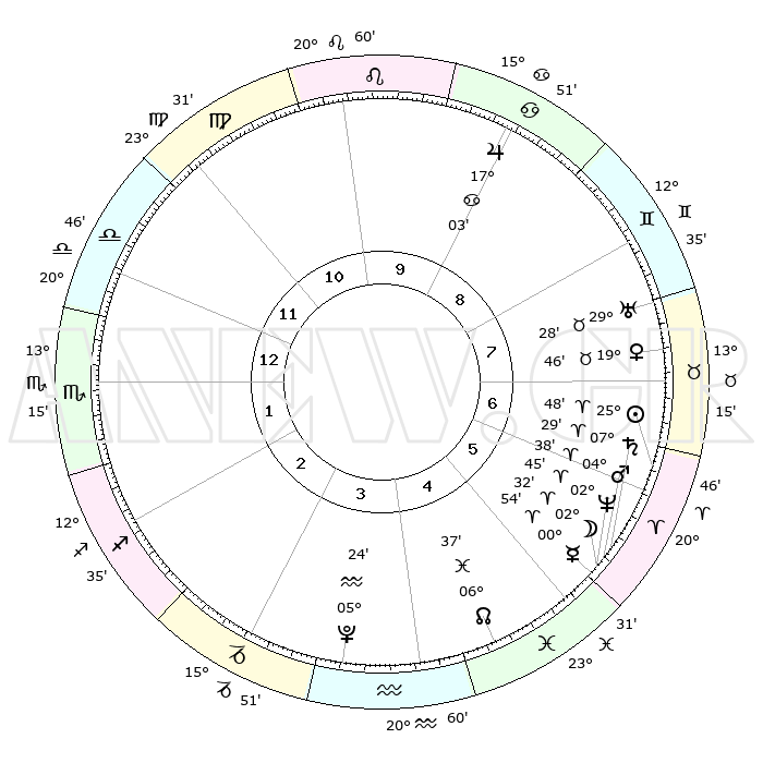 | | ΘΕΣΕΙΣ ΠΛΑΝΗΤΩΝ ΑΣΤΡΟΛΟΓΙΚΟΥ ΧΑΡΤΗ ΤΗΣ ΣΤΙΓΜΗΣ ΑΥΤΗΣ | | | | Πλανήτης | Ζώδιο | Μοίρες | Δεκαήμ. | Σε οίκο | Απόκλιση | | Ακμές των οίκων | | Ηλιος | Κριός | 25°44' | Τρίτο | 7 | 09 N 57 | | 1ος | 25°30' | Ζυγός | | Σελήνη | Κριός | 01°40' | Πρώτο | 6 | 02 N 33 | | 2ος | 23°39' | Σκορπιός | | Ερμής | Κριός | 00°48' | Πρώτο | 5 | 02 S 04 | | 3ος | 25°17' | Τοξότης | | Αφροδίτη | Ταύρος | 19°41' | Δεύτερο | 7 | 17 N 51 | | 4ος | 29°11' | Αιγόκερως | | Αρης | Κριός | 04°35' | Πρώτο | 6 | 00 N 55 | | 5ος | 02°08' | Ιχθείς | | Δίας | Καρκίνος | 17°02' | Δεύτερο | 9 | 22 N 44 | | 6ος | 01°11' | Κριός | | Κρόνος | Κριός | 07°28' | Πρώτο | 6 | 01 N 00 | | 7ος | 25°30' | Κριός | | Ουρανός | Ταύρος | 29°28' | Τρίτο | 8 | 19 N 52 | | 8ος | 23°39' | Ταύρος | | Ποσειδώνας | Κριός | 02°45' | Πρώτο | 6 | 00 S 07 | | 9ος | 25°17' | Δίδυμοι | | Πλούτωνας | Υδροχόος | 05°24' | Πρώτο | 4 | 22 S 47 | | 10ος | 29°11' | Καρκίνος | | Β. Δεσμός | Ιχθείς | 06°38' | Πρώτο | 5 | 09 S 05 | | 11ος | 02°08' | Παρθένος | | Ωροσκόπος | Ζυγός | 25°30' | Τρίτο | | | 12ος | 01°11' | Ζυγός | | Μεσουράνημα | Καρκίνος | 29°11' | Τρίτο | | | |