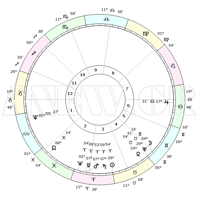 | | ΘΕΣΕΙΣ ΠΛΑΝΗΤΩΝ ΑΣΤΡΟΛΟΓΙΚΟΥ ΧΑΡΤΗ ΤΗΣ ΣΤΙΓΜΗΣ ΑΥΤΗΣ | | | | Πλανήτης | Ζώδιο | Μοίρες | Δεκαήμ. | Σε οίκο | Απόκλιση | | Ακμές των οίκων | | Ηλιος | Κριός | 28°51' | Τρίτο | 4 | 11 N 04 | | 1ος | 22°22' | Τοξότης | | Σελήνη | Ταύρος | 18°12' | Δεύτερο | 5 | 21 N 52 | | 2ος | 27°40' | Αιγόκερως | | Ερμής | Κριός | 05°30' | Πρώτο | 3 | 00 S 14 | | 3ος | 06°55' | Ιχθείς | | Αφροδίτη | Ταύρος | 23°35' | Τρίτο | 5 | 19 N 00 | | 4ος | 11°55' | Κριός | | Αρης | Κριός | 07°03' | Πρώτο | 3 | 01 N 55 | | 5ος | 09°30' | Ταύρος | | Δίας | Καρκίνος | 17°23' | Δεύτερο | 7 | 22 N 41 | | 6ος | 01°53' | Δίδυμοι | | Κρόνος | Κριός | 07°51' | Πρώτο | 3 | 01 N 08 | | 7ος | 22°22' | Δίδυμοι | | Ουρανός | Ταύρος | 29°37' | Τρίτο | 5 | 19 N 54 | | 8ος | 27°40' | Καρκίνος | | Ποσειδώνας | Κριός | 02°52' | Πρώτο | 3 | 00 S 04 | | 9ος | 06°55' | Παρθένος | | Πλούτωνας | Υδροχόος | 05°26' | Πρώτο | 2 | 22 S 47 | | 10ος | 11°55' | Ζυγός | | Β. Δεσμός | Ιχθείς | 06°27' | Πρώτο | 2 | 09 S 08 | | 11ος | 09°30' | Σκορπιός | | Ωροσκόπος | Τοξότης | 22°22' | Τρίτο | | | 12ος | 01°53' | Τοξότης | | Μεσουράνημα | Ζυγός | 11°55' | Δεύτερο | | | |