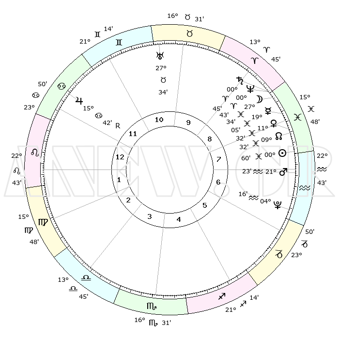 | | ΘΕΣΕΙΣ ΠΛΑΝΗΤΩΝ ΑΣΤΡΟΛΟΓΙΚΟΥ ΧΑΡΤΗ ΤΗΣ ΣΤΙΓΜΗΣ ΑΥΤΗΣ | | | | Πλανήτης | Ζώδιο | Μοίρες | Δεκαήμ. | Σε οίκο | Απόκλιση | | Ακμές των οίκων | | Ηλιος | Ιχθείς | 00°55' | Πρώτο | 8 | 11 S 09 | | 1ος | 02°60' | Λέων | | Σελήνη | Ιχθείς | 26°39' | Τρίτο | 9 | 00 N 09 | | 2ος | 24°15' | Λέων | | Ερμής | Ιχθείς | 19°01' | Δεύτερο | 8 | 03 S 18 | | 3ος | 19°42' | Παρθένος | | Αφροδίτη | Ιχθείς | 11°27' | Δεύτερο | 8 | 08 S 37 | | 4ος | 21°05' | Ζυγός | | Αρης | Υδροχόος | 21°20' | Τρίτο | 7 | 15 S 25 | | 5ος | 27°03' | Σκορπιός | | Δίας | Καρκίνος | 15°42'R | Δεύτερο | 12 | 22 N 50 | | 6ος | 02°16' | Αιγόκερως | | Κρόνος | Κριός | 00°44' | Πρώτο | 9 | 01 S 40 | | 7ος | 02°60' | Υδροχόος | | Ουρανός | Ταύρος | 27°34' | Τρίτο | 11 | 19 N 26 | | 8ος | 24°15' | Υδροχόος | | Ποσειδώνας | Κριός | 00°43' | Πρώτο | 9 | 00 S 55 | | 9ος | 19°42' | Ιχθείς | | Πλούτωνας | Υδροχόος | 04°16' | Πρώτο | 7 | 22 S 55 | | 10ος | 21°05' | Κριός | | Β. Δεσμός | Ιχθείς | 09°33' | Πρώτο | 8 | 07 S 59 | | 11ος | 27°03' | Ταύρος | | Ωροσκόπος | Λέων | 02°60' | Πρώτο | | | 12ος | 02°16' | Καρκίνος | | Μεσουράνημα | Κριός | 21°05' | Τρίτο | | | |