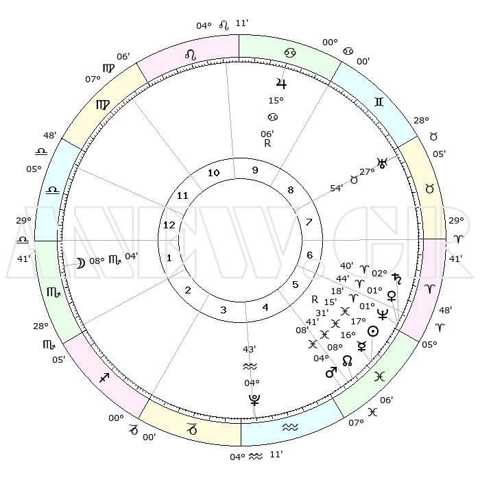 | | ΘΕΣΕΙΣ ΠΛΑΝΗΤΩΝ ΑΣΤΡΟΛΟΓΙΚΟΥ ΧΑΡΤΗ ΤΗΣ ΣΤΙΓΜΗΣ ΑΥΤΗΣ | | | | Πλανήτης | Ζώδιο | Μοίρες | Δεκαήμ. | Σε οίκο | Απόκλιση | | Ακμές των οίκων | | Ηλιος | Ιχθείς | 16°08' | Δεύτερο | 6 | 05 S 28 | | 1ος | 23°23' | Παρθένος | | Σελήνη | Ζυγός | 24°17' | Τρίτο | 2 | 12 S 54 | | 2ος | 19°28' | Ζυγός | | Ερμής | Ιχθείς | 17°38'R | Δεύτερο | 6 | 01 S 30 | | 3ος | 19°38' | Σκορπιός | | Αφροδίτη | Κριός | 00°20' | Πρώτο | 7 | 01 S 01 | | 4ος | 22°34' | Τοξότης | | Αρης | Ιχθείς | 03°15' | Πρώτο | 6 | 11 S 20 | | 5ος | 25°39' | Αιγόκερως | | Δίας | Καρκίνος | 15°07'R | Δεύτερο | 10 | 22 N 55 | | 6ος | 26°20' | Υδροχόος | | Κρόνος | Κριός | 02°32' | Πρώτο | 7 | 00 S 57 | | 7ος | 23°23' | Ιχθείς | | Ουρανός | Ταύρος | 27°52' | Τρίτο | 9 | 19 N 30 | | 8ος | 19°28' | Κριός | | Ποσειδώνας | Κριός | 01°15' | Πρώτο | 7 | 00 S 42 | | 9ος | 19°38' | Ταύρος | | Πλούτωνας | Υδροχόος | 04°41' | Πρώτο | 5 | 22 S 51 | | 10ος | 22°34' | Δίδυμοι | | Β. Δεσμός | Ιχθείς | 08°45' | Πρώτο | 6 | 08 S 17 | | 11ος | 25°39' | Καρκίνος | | Ωροσκόπος | Παρθένος | 23°23' | Τρίτο | | | 12ος | 26°20' | Λέων | | Μεσουράνημα | Δίδυμοι | 22°34' | Τρίτο | | | |