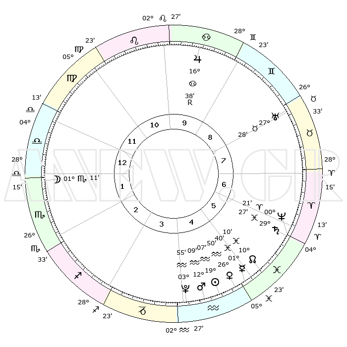| | ΘΕΣΕΙΣ ΠΛΑΝΗΤΩΝ ΑΣΤΡΟΛΟΓΙΚΟΥ ΧΑΡΤΗ ΤΗΣ ΣΤΙΓΜΗΣ ΑΥΤΗΣ | | | | Πλανήτης | Ζώδιο | Μοίρες | Δεκαήμ. | Σε οίκο | Απόκλιση | | Ακμές των οίκων | | Ηλιος | Υδροχόος | 18°14' | Δεύτερο | 3 | 15 S 21 | | 1ος | 05°00' | Τοξότης | | Σελήνη | Ζυγός | 20°32' | Τρίτο | 11 | 11 S 14 | | 2ος | 06°53' | Αιγόκερως | | Ερμής | Ιχθείς | 00°09' | Πρώτο | 3 | 12 S 40 | | 3ος | 13°26' | Υδροχόος | | Αφροδίτη | Υδροχόος | 25°45' | Τρίτο | 3 | 14 S 17 | | 4ος | 19°31' | Ιχθείς | | Αρης | Υδροχόος | 11°28' | Δεύτερο | 2 | 18 S 21 | | 5ος | 19°53' | Κριός | | Δίας | Καρκίνος | 16°43'R | Δεύτερο | 8 | 22 N 42 | | 6ος | 14°16' | Ταύρος | | Κρόνος | Ιχθείς | 29°22' | Τρίτο | 4 | 02 S 14 | | 7ος | 05°00' | Δίδυμοι | | Ουρανός | Ταύρος | 27°28' | Τρίτο | 6 | 19 N 24 | | 8ος | 06°53' | Καρκίνος | | Ποσειδώνας | Κριός | 00°19' | Πρώτο | 4 | 01 S 05 | | 9ος | 13°26' | Λέων | | Πλούτωνας | Υδροχόος | 03°53' | Πρώτο | 2 | 22 S 59 | | 10ος | 19°31' | Παρθένος | | Β. Δεσμός | Ιχθείς | 10°13' | Δεύτερο | 3 | 07 S 44 | | 11ος | 19°53' | Ζυγός | | Ωροσκόπος | Τοξότης | 05°00' | Πρώτο | | | 12ος | 14°16' | Σκορπιός | | Μεσουράνημα | Παρθένος | 19°31' | Δεύτερο | | | |