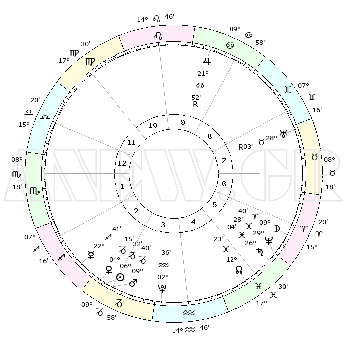 | | ΘΕΣΕΙΣ ΠΛΑΝΗΤΩΝ ΑΣΤΡΟΛΟΓΙΚΟΥ ΧΑΡΤΗ ΤΗΣ ΣΤΙΓΜΗΣ ΑΥΤΗΣ | | | | Πλανήτης | Ζώδιο | Μοίρες | Δεκαήμ. | Σε οίκο | Απόκλιση | | Ακμές των οίκων | | Ηλιος | Αιγόκερως | 07°17' | Πρώτο | 5 | 23 S 14 | | 1ος | 18°49' | Λέων | | Σελήνη | Κριός | 19°44' | Δεύτερο | 9 | 10 N 39 | | 2ος | 11°30' | Παρθένος | | Ερμής | Τοξότης | 23°46' | Τρίτο | 5 | 23 S 29 | | 3ος | 09°00' | Ζυγός | | Αφροδίτη | Αιγόκερως | 05°09' | Πρώτο | 5 | 23 S 43 | | 4ος | 11°37' | Σκορπιός | | Αρης | Αιγόκερως | 10°14' | Δεύτερο | 5 | 23 S 54 | | 5ος | 16°37' | Τοξότης | | Δίας | Καρκίνος | 21°46'R | Τρίτο | 12 | 21 N 54 | | 6ος | 19°39' | Αιγόκερως | | Κρόνος | Ιχθείς | 26°06' | Τρίτο | 8 | 03 S 38 | | 7ος | 18°49' | Υδροχόος | | Ουρανός | Ταύρος | 28°02'R | Τρίτο | 10 | 19 N 31 | | 8ος | 11°30' | Ιχθείς | | Ποσειδώνας | Ιχθείς | 29°28' | Τρίτο | 8 | 01 S 26 | | 9ος | 09°00' | Κριός | | Πλούτωνας | Υδροχόος | 02°38' | Πρώτο | 6 | 23 S 14 | | 10ος | 11°37' | Ταύρος | | Β. Δεσμός | Ιχθείς | 12°20' | Δεύτερο | 8 | 06 S 56 | | 11ος | 16°37' | Δίδυμοι | | Ωροσκόπος | Λέων | 18°49' | Δεύτερο | | | 12ος | 19°39' | Καρκίνος | | Μεσουράνημα | Ταύρος | 11°37' | Δεύτερο | | | |