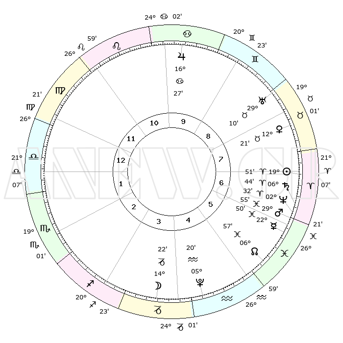 | | ΘΕΣΕΙΣ ΠΛΑΝΗΤΩΝ ΑΣΤΡΟΛΟΓΙΚΟΥ ΧΑΡΤΗ ΤΗΣ ΣΤΙΓΜΗΣ ΑΥΤΗΣ | | | | Πλανήτης | Ζώδιο | Μοίρες | Δεκαήμ. | Σε οίκο | Απόκλιση | | Ακμές των οίκων | | Ηλιος | Κριός | 19°48' | Δεύτερο | 7 | 07 N 44 | | 1ος | 02°07' | Ζυγός | | Σελήνη | Αιγόκερως | 13°35' | Δεύτερο | 4 | 26 S 56 | | 2ος | 28°52' | Ζυγός | | Ερμής | Ιχθείς | 22°46' | Τρίτο | 6 | 05 S 00 | | 3ος | 29°23' | Σκορπιός | | Αφροδίτη | Ταύρος | 12°16' | Δεύτερο | 8 | 15 N 27 | | 4ος | 02°23' | Αιγόκερως | | Αρης | Ιχθείς | 29°52' | Τρίτο | 6 | 00 S 59 | | 5ος | 05°20' | Υδροχόος | | Δίας | Καρκίνος | 16°27' | Δεύτερο | 10 | 22 N 48 | | 6ος | 05°42' | Ιχθείς | | Κρόνος | Κριός | 06°44' | Πρώτο | 7 | 00 N 42 | | 7ος | 02°07' | Κριός | | Ουρανός | Ταύρος | 29°10' | Τρίτο | 8 | 19 N 48 | | 8ος | 28°52' | Κριός | | Ποσειδώνας | Κριός | 02°32' | Πρώτο | 7 | 00 S 12 | | 9ος | 29°23' | Ταύρος | | Πλούτωνας | Υδροχόος | 05°20' | Πρώτο | 4 | 22 S 47 | | 10ος | 02°23' | Καρκίνος | | Β. Δεσμός | Ιχθείς | 06°57' | Πρώτο | 6 | 08 S 58 | | 11ος | 05°20' | Λέων | | Ωροσκόπος | Ζυγός | 02°07' | Πρώτο | | | 12ος | 05°42' | Παρθένος | | Μεσουράνημα | Καρκίνος | 02°23' | Πρώτο | | | |