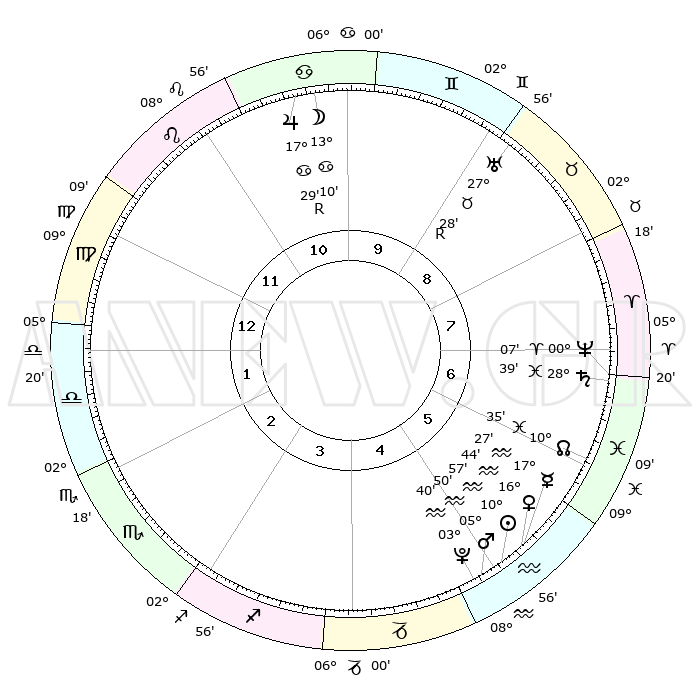 | | ΘΕΣΕΙΣ ΠΛΑΝΗΤΩΝ ΑΣΤΡΟΛΟΓΙΚΟΥ ΧΑΡΤΗ ΤΗΣ ΣΤΙΓΜΗΣ ΑΥΤΗΣ | | | | Πλανήτης | Ζώδιο | Μοίρες | Δεκαήμ. | Σε οίκο | Απόκλιση | | Ακμές των οίκων | | Ηλιος | Υδροχόος | 10°54' | Δεύτερο | 5 | 17 S 30 | | 1ος | 17°56' | Παρθένος | | Σελήνη | Καρκίνος | 12°18' | Δεύτερο | 10 | 27 N 13 | | 2ος | 13°33' | Ζυγός | | Ερμής | Υδροχόος | 17°20' | Δεύτερο | 5 | 17 S 29 | | 3ος | 13°28' | Σκορπιός | | Αφροδίτη | Υδροχόος | 16°40' | Δεύτερο | 5 | 17 S 07 | | 4ος | 16°24' | Τοξότης | | Αρης | Υδροχόος | 05°47' | Πρώτο | 5 | 19 S 50 | | 5ος | 19°39' | Αιγόκερως | | Δίας | Καρκίνος | 17°30'R | Δεύτερο | 10 | 22 N 35 | | 6ος | 20°33' | Υδροχόος | | Κρόνος | Ιχθείς | 28°38' | Τρίτο | 7 | 02 S 32 | | 7ος | 17°56' | Ιχθείς | | Ουρανός | Ταύρος | 27°28'R | Τρίτο | 9 | 19 N 24 | | 8ος | 13°33' | Κριός | | Ποσειδώνας | Κριός | 00°07' | Πρώτο | 7 | 01 S 10 | | 9ος | 13°28' | Ταύρος | | Πλούτωνας | Υδροχόος | 03°40' | Πρώτο | 5 | 23 S 02 | | 10ος | 16°24' | Δίδυμοι | | Β. Δεσμός | Ιχθείς | 10°36' | Δεύτερο | 6 | 07 S 36 | | 11ος | 19°39' | Καρκίνος | | Ωροσκόπος | Παρθένος | 17°56' | Δεύτερο | | | 12ος | 20°33' | Λέων | | Μεσουράνημα | Δίδυμοι | 16°24' | Δεύτερο | | | |