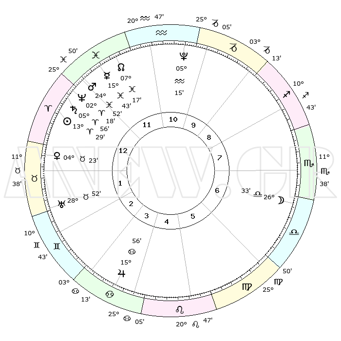 | | ΘΕΣΕΙΣ ΠΛΑΝΗΤΩΝ ΑΣΤΡΟΛΟΓΙΚΟΥ ΧΑΡΤΗ ΤΗΣ ΣΤΙΓΜΗΣ ΑΥΤΗΣ | | | | Πλανήτης | Ζώδιο | Μοίρες | Δεκαήμ. | Σε οίκο | Απόκλιση | | Ακμές των οίκων | | Ηλιος | Κριός | 13°24' | Δεύτερο | 1 | 05 N 17 | | 1ος | 00°20' | Κριός | | Σελήνη | Ζυγός | 25°37' | Τρίτο | 7 | 13 S 26 | | 2ος | 10°33' | Ταύρος | | Ερμής | Ιχθείς | 15°38' | Δεύτερο | 12 | 07 S 09 | | 3ος | 07°54' | Δίδυμοι | | Αφροδίτη | Ταύρος | 04°18' | Πρώτο | 1 | 12 N 37 | | 4ος | 00°11' | Καρκίνος | | Αρης | Ιχθείς | 24°49' | Τρίτο | 12 | 03 S 01 | | 5ος | 22°30' | Καρκίνος | | Δίας | Καρκίνος | 15°56' | Δεύτερο | 4 | 22 N 51 | | 6ος | 19°57' | Λέων | | Κρόνος | Κριός | 05°56' | Πρώτο | 1 | 00 N 24 | | 7ος | 00°20' | Ζυγός | | Ουρανός | Ταύρος | 28°52' | Τρίτο | 2 | 19 N 44 | | 8ος | 10°33' | Σκορπιός | | Ποσειδώνας | Κριός | 02°17' | Πρώτο | 1 | 00 S 17 | | 9ος | 07°54' | Τοξότης | | Πλούτωνας | Υδροχόος | 05°15' | Πρώτο | 11 | 22 S 47 | | 10ος | 00°11' | Αιγόκερως | | Β. Δεσμός | Ιχθείς | 07°17' | Πρώτο | 12 | 08 S 50 | | 11ος | 22°30' | Αιγόκερως | | Ωροσκόπος | Κριός | 00°20' | Πρώτο | | | 12ος | 19°57' | Υδροχόος | | Μεσουράνημα | Αιγόκερως | 00°11' | Πρώτο | | | |