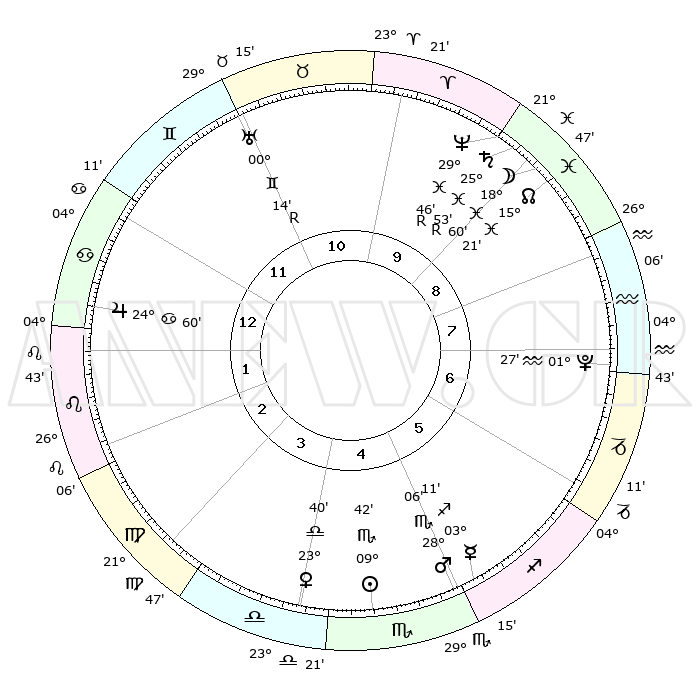 | | ΘΕΣΕΙΣ ΠΛΑΝΗΤΩΝ ΑΣΤΡΟΛΟΓΙΚΟΥ ΧΑΡΤΗ ΤΗΣ ΣΤΙΓΜΗΣ ΑΥΤΗΣ | | | | Πλανήτης | Ζώδιο | Μοίρες | Δεκαήμ. | Σε οίκο | Απόκλιση | | Ακμές των οίκων | | Ηλιος | Σκορπιός | 09°02' | Πρώτο | 12 | 14 S 30 | | 1ος | 11°18' | Σκορπιός | | Σελήνη | Ιχθείς | 09°45' | Πρώτο | 4 | 08 S 31 | | 2ος | 10°29' | Τοξότης | | Ερμής | Τοξότης | 02°37' | Πρώτο | 1 | 23 S 31 | | 3ος | 13°31' | Αιγόκερως | | Αφροδίτη | Ζυγός | 22°50' | Τρίτο | 12 | 07 S 31 | | 4ος | 18°31' | Υδροχόος | | Αρης | Σκορπιός | 27°38' | Τρίτο | 1 | 20 S 01 | | 5ος | 21°08' | Ιχθείς | | Δίας | Καρκίνος | 24°58' | Τρίτο | 9 | 21 N 13 | | 6ος | 18°38' | Κριός | | Κρόνος | Ιχθείς | 25°55'R | Τρίτο | 5 | 03 S 53 | | 7ος | 11°18' | Ταύρος | | Ουρανός | Δίδυμοι | 00°16'R | Πρώτο | 7 | 20 N 00 | | 8ος | 10°29' | Δίδυμοι | | Ποσειδώνας | Ιχθείς | 29°47'R | Τρίτο | 5 | 01 S 20 | | 9ος | 13°31' | Καρκίνος | | Πλούτωνας | Υδροχόος | 01°27' | Πρώτο | 3 | 23 S 31 | | 10ος | 18°32' | Λέων | | Β. Δεσμός | Ιχθείς | 15°23' | Δεύτερο | 4 | 05 S 45 | | 11ος | 21°08' | Παρθένος | | Ωροσκόπος | Σκορπιός | 11°18' | Δεύτερο | | | 12ος | 18°38' | Ζυγός | | Μεσουράνημα | Λέων | 18°32' | Δεύτερο | | | |