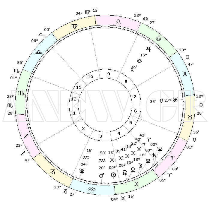 | | ΘΕΣΕΙΣ ΠΛΑΝΗΤΩΝ ΑΣΤΡΟΛΟΓΙΚΟΥ ΧΑΡΤΗ ΤΗΣ ΣΤΙΓΜΗΣ ΑΥΤΗΣ | | | | Πλανήτης | Ζώδιο | Μοίρες | Δεκαήμ. | Σε οίκο | Απόκλιση | | Ακμές των οίκων | | Ηλιος | Ιχθείς | 00°14' | Πρώτο | 4 | 11 S 23 | | 1ος | 02°08' | Σκορπιός | | Σελήνη | Ιχθείς | 17°15' | Δεύτερο | 5 | 04 S 20 | | 2ος | 00°41' | Τοξότης | | Ερμής | Ιχθείς | 18°17' | Δεύτερο | 5 | 03 S 45 | | 3ος | 02°49' | Αιγόκερως | | Αφροδίτη | Ιχθείς | 10°35' | Δεύτερο | 5 | 08 S 57 | | 4ος | 07°09' | Υδροχόος | | Αρης | Υδροχόος | 20°47' | Τρίτο | 4 | 15 S 36 | | 5ος | 10°02' | Ιχθείς | | Δίας | Καρκίνος | 15°45'R | Δεύτερο | 9 | 22 N 50 | | 6ος | 08°31' | Κριός | | Κρόνος | Κριός | 00°40' | Πρώτο | 5 | 01 S 42 | | 7ος | 02°08' | Ταύρος | | Ουρανός | Ταύρος | 27°33' | Τρίτο | 7 | 19 N 26 | | 8ος | 00°41' | Δίδυμοι | | Ποσειδώνας | Κριός | 00°42' | Πρώτο | 5 | 00 S 55 | | 9ος | 02°49' | Καρκίνος | | Πλούτωνας | Υδροχόος | 04°15' | Πρώτο | 3 | 22 S 55 | | 10ος | 07°09' | Λέων | | Β. Δεσμός | Ιχθείς | 09°35' | Πρώτο | 4 | 07 S 59 | | 11ος | 10°02' | Παρθένος | | Ωροσκόπος | Σκορπιός | 02°08' | Πρώτο | | | 12ος | 08°31' | Ζυγός | | Μεσουράνημα | Λέων | 07°09' | Πρώτο | | | |