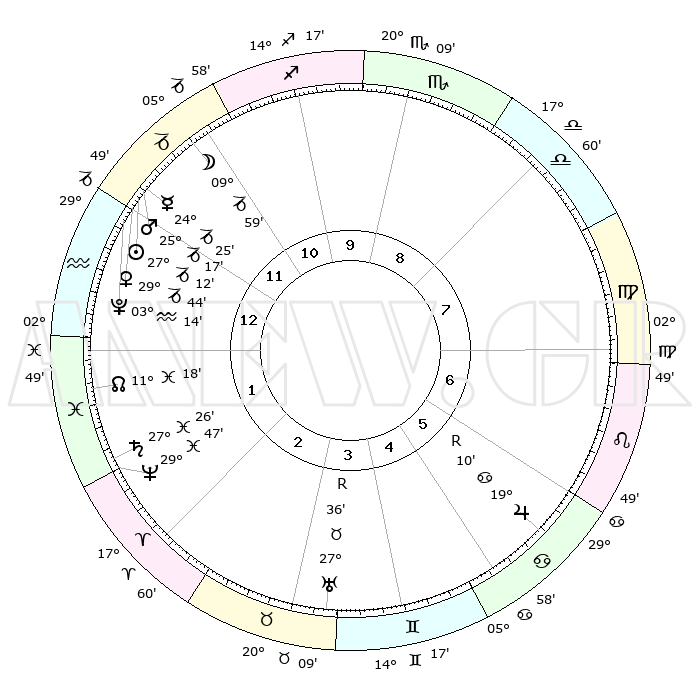 | | ΘΕΣΕΙΣ ΠΛΑΝΗΤΩΝ ΑΣΤΡΟΛΟΓΙΚΟΥ ΧΑΡΤΗ ΤΗΣ ΣΤΙΓΜΗΣ ΑΥΤΗΣ | | | | Πλανήτης | Ζώδιο | Μοίρες | Δεκαήμ. | Σε οίκο | Απόκλιση | | Ακμές των οίκων | | Ηλιος | Αιγόκερως | 27°07' | Τρίτο | 12 | 20 S 44 | | 1ος | 28°01' | Αιγόκερως | | Σελήνη | Αιγόκερως | 09°06' | Πρώτο | 12 | 27 S 35 | | 2ος | 11°46' | Ιχθείς | | Ερμής | Αιγόκερως | 24°18' | Τρίτο | 12 | 23 S 07 | | 3ος | 20°31' | Κριός | | Αφροδίτη | Αιγόκερως | 29°39' | Τρίτο | 1 | 21 S 14 | | 4ος | 19°20' | Ταύρος | | Αρης | Αιγόκερως | 25°14' | Τρίτο | 12 | 22 S 03 | | 5ος | 12°15' | Δίδυμοι | | Δίας | Καρκίνος | 19°11'R | Δεύτερο | 6 | 22 N 20 | | 6ος | 03°36' | Καρκίνος | | Κρόνος | Ιχθείς | 27°26' | Τρίτο | 2 | 03 S 03 | | 7ος | 28°01' | Καρκίνος | | Ουρανός | Ταύρος | 27°36'R | Τρίτο | 4 | 19 N 26 | | 8ος | 11°46' | Παρθένος | | Ποσειδώνας | Ιχθείς | 29°47' | Τρίτο | 2 | 01 S 18 | | 9ος | 20°31' | Ζυγός | | Πλούτωνας | Υδροχόος | 03°14' | Πρώτο | 1 | 23 S 07 | | 10ος | 19°20' | Σκορπιός | | Β. Δεσμός | Ιχθείς | 11°19' | Δεύτερο | 1 | 07 S 19 | | 11ος | 12°15' | Τοξότης | | Ωροσκόπος | Αιγόκερως | 28°01' | Τρίτο | | | 12ος | 03°36' | Αιγόκερως | | Μεσουράνημα | Σκορπιός | 19°20' | Δεύτερο | | | |