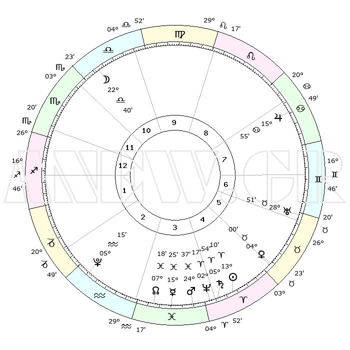 | | ΘΕΣΕΙΣ ΠΛΑΝΗΤΩΝ ΑΣΤΡΟΛΟΓΙΚΟΥ ΧΑΡΤΗ ΤΗΣ ΣΤΙΓΜΗΣ ΑΥΤΗΣ | | | | Πλανήτης | Ζώδιο | Μοίρες | Δεκαήμ. | Σε οίκο | Απόκλιση | | Ακμές των οίκων | | Ηλιος | Κριός | 13°06' | Δεύτερο | 5 | 05 N 10 | | 1ος | 27°07' | Σκορπιός | | Σελήνη | Ζυγός | 21°51' | Τρίτο | 11 | 11 S 48 | | 2ος | 27°52' | Τοξότης | | Ερμής | Ιχθείς | 15°21' | Δεύτερο | 4 | 07 S 14 | | 3ος | 03°06' | Υδροχόος | | Αφροδίτη | Ταύρος | 03°56' | Πρώτο | 5 | 12 N 29 | | 4ος | 09°04' | Ιχθείς | | Αρης | Ιχθείς | 24°34' | Τρίτο | 4 | 03 S 06 | | 5ος | 10°26' | Κριός | | Δίας | Καρκίνος | 15°54' | Δεύτερο | 8 | 22 N 51 | | 6ος | 05°53' | Ταύρος | | Κρόνος | Κριός | 05°54' | Πρώτο | 4 | 00 N 23 | | 7ος | 27°07' | Ταύρος | | Ουρανός | Ταύρος | 28°51' | Τρίτο | 7 | 19 N 44 | | 8ος | 27°52' | Δίδυμοι | | Ποσειδώνας | Κριός | 02°17' | Πρώτο | 4 | 00 S 18 | | 9ος | 03°06' | Λέων | | Πλούτωνας | Υδροχόος | 05°15' | Πρώτο | 3 | 22 S 47 | | 10ος | 09°04' | Παρθένος | | Β. Δεσμός | Ιχθείς | 07°18' | Πρώτο | 3 | 08 S 50 | | 11ος | 10°26' | Ζυγός | | Ωροσκόπος | Σκορπιός | 27°07' | Τρίτο | | | 12ος | 05°53' | Σκορπιός | | Μεσουράνημα | Παρθένος | 09°04' | Πρώτο | | | |