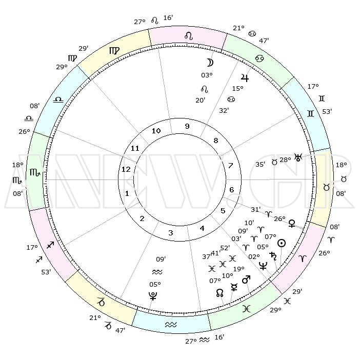 | | ΘΕΣΕΙΣ ΠΛΑΝΗΤΩΝ ΑΣΤΡΟΛΟΓΙΚΟΥ ΧΑΡΤΗ ΤΗΣ ΣΤΙΓΜΗΣ ΑΥΤΗΣ | | | | Πλανήτης | Ζώδιο | Μοίρες | Δεκαήμ. | Σε οίκο | Απόκλιση | | Ακμές των οίκων | | Ηλιος | Κριός | 07°06' | Πρώτο | 6 | 02 N 49 | | 1ος | 29°12' | Ζυγός | | Σελήνη | Λέων | 02°27' | Πρώτο | 9 | 22 N 38 | | 2ος | 27°34' | Σκορπιός | | Ερμής | Ιχθείς | 10°39' | Δεύτερο | 5 | 08 S 05 | | 3ος | 29°28' | Τοξότης | | Αφροδίτη | Κριός | 26°26' | Τρίτο | 6 | 09 N 38 | | 4ος | 03°36' | Υδροχόος | | Αρης | Ιχθείς | 19°49' | Δεύτερο | 5 | 05 S 00 | | 5ος | 06°31' | Ιχθείς | | Δίας | Καρκίνος | 15°32' | Δεύτερο | 9 | 22 N 54 | | 6ος | 05°16' | Κριός | | Κρόνος | Κριός | 05°08' | Πρώτο | 5 | 00 N 05 | | 7ος | 29°12' | Κριός | | Ουρανός | Ταύρος | 28°35' | Τρίτο | 8 | 19 N 40 | | 8ος | 27°34' | Ταύρος | | Ποσειδώνας | Κριός | 02°03' | Πρώτο | 5 | 00 S 23 | | 9ος | 29°28' | Δίδυμοι | | Πλούτωνας | Υδροχόος | 05°09' | Πρώτο | 4 | 22 S 48 | | 10ος | 03°36' | Λέων | | Β. Δεσμός | Ιχθείς | 07°38' | Πρώτο | 5 | 08 S 42 | | 11ος | 06°32' | Παρθένος | | Ωροσκόπος | Ζυγός | 29°12' | Τρίτο | | | 12ος | 05°16' | Ζυγός | | Μεσουράνημα | Λέων | 03°36' | Πρώτο | | | |