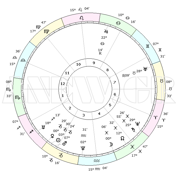 | | ΘΕΣΕΙΣ ΠΛΑΝΗΤΩΝ ΑΣΤΡΟΛΟΓΙΚΟΥ ΧΑΡΤΗ ΤΗΣ ΣΤΙΓΜΗΣ ΑΥΤΗΣ | | | | Πλανήτης | Ζώδιο | Μοίρες | Δεκαήμ. | Σε οίκο | Απόκλιση | | Ακμές των οίκων | | Ηλιος | Αιγόκερως | 03°26' | Πρώτο | 3 | 23 S 23 | | 1ος | 19°57' | Ζυγός | | Σελήνη | Υδροχόος | 29°17' | Τρίτο | 5 | 12 S 42 | | 2ος | 17°47' | Σκορπιός | | Ερμής | Τοξότης | 18°08' | Δεύτερο | 2 | 22 S 39 | | 3ος | 19°04' | Τοξότης | | Αφροδίτη | Αιγόκερως | 00°24' | Πρώτο | 3 | 23 S 40 | | 4ος | 22°39' | Αιγόκερως | | Αρης | Αιγόκερως | 07°21' | Πρώτο | 3 | 24 S 04 | | 5ος | 25°37' | Υδροχόος | | Δίας | Καρκίνος | 22°14'R | Τρίτο | 9 | 21 N 49 | | 6ος | 25°04' | Ιχθείς | | Κρόνος | Ιχθείς | 25°55' | Τρίτο | 6 | 03 S 43 | | 7ος | 19°57' | Κριός | | Ουρανός | Ταύρος | 28°09'R | Τρίτο | 8 | 19 N 33 | | 8ος | 17°47' | Ταύρος | | Ποσειδώνας | Ιχθείς | 29°26' | Τρίτο | 6 | 01 S 27 | | 9ος | 19°04' | Δίδυμοι | | Πλούτωνας | Υδροχόος | 02°31' | Πρώτο | 4 | 23 S 16 | | 10ος | 22°39' | Καρκίνος | | Β. Δεσμός | Ιχθείς | 12°32' | Δεύτερο | 5 | 06 S 51 | | 11ος | 25°37' | Λέων | | Ωροσκόπος | Ζυγός | 19°57' | Δεύτερο | | | 12ος | 25°04' | Παρθένος | | Μεσουράνημα | Καρκίνος | 22°39' | Τρίτο | | | |
