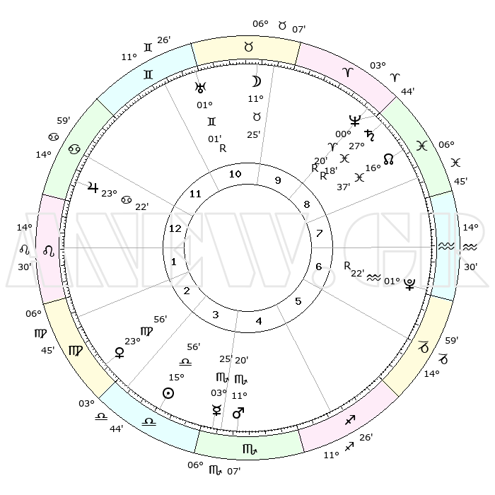 | ΘΕΣΕΙΣ ΠΛΑΝΗΤΩΝ ΑΣΤΡΟΛΟΓΙΚΟΥ ΧΑΡΤΗ ΤΗΣ ΣΤΙΓΜΗΣ ΑΥΤΗΣ | | Πλανήτης | Ζώδιο | Μοίρες | Δεκαήμ. | Σε οίκο | Απόκλιση | | Ακμές των οίκων | Ηλιος | Ζυγός | 15°50' | Δεύτερο | 4 | 06 S 14 | | 1ος | 15°56' | Καρκίνος | Σελήνη | Ταύρος | 09°58' | Πρώτο | 11 | 18 N 41 | | 2ος | 06°23' | Λέων | Ερμής | Σκορπιός | 03°17' | Πρώτο | 4 | 13 S 35 | | 3ος | 29°38' | Λέων | Αφροδίτη | Παρθένος | 23°48' | Τρίτο | 3 | 03 N 47 | | 4ος | 28°36' | Παρθένος | Αρης | Σκορπιός | 11°16' | Δεύτερο | 5 | 15 S 22 | | 5ος | 04°23' | Σκορπιός | Δίας | Καρκίνος | 23°21' | Τρίτο | 1 | 21 N 27 | | 6ος | 12°26' | Τοξότης | Κρόνος | Ιχθείς | 27°18'R | Τρίτο | 9 | 03 S 22 | | 7ος | 15°56' | Αιγόκερως | Ουρανός | Δίδυμοι | 01°01'R | Πρώτο | 11 | 20 N 09 | | 8ος | 06°23' | Υδροχόος | Ποσειδώνας | Κριός | 00°20'R | Πρώτο | 10 | 01 S 08 | | 9ος | 29°38' | Υδροχόος | Πλούτωνας | Υδροχόος | 01°22'R | Πρώτο | 7 | 23 S 32 | | 10ος | 28°36' | Ιχθείς | Β. Δεσμός | Ιχθείς | 16°37' | Δεύτερο | 9 | 05 S 17 | | 11ος | 04°23' | Ταύρος | Ωροσκόπος | Καρκίνος | 15°56' | Δεύτερο | | | 12ος | 12°26' | Δίδυμοι | Μεσουράνημα | Ιχθείς | 28°36' | Τρίτο | | | |