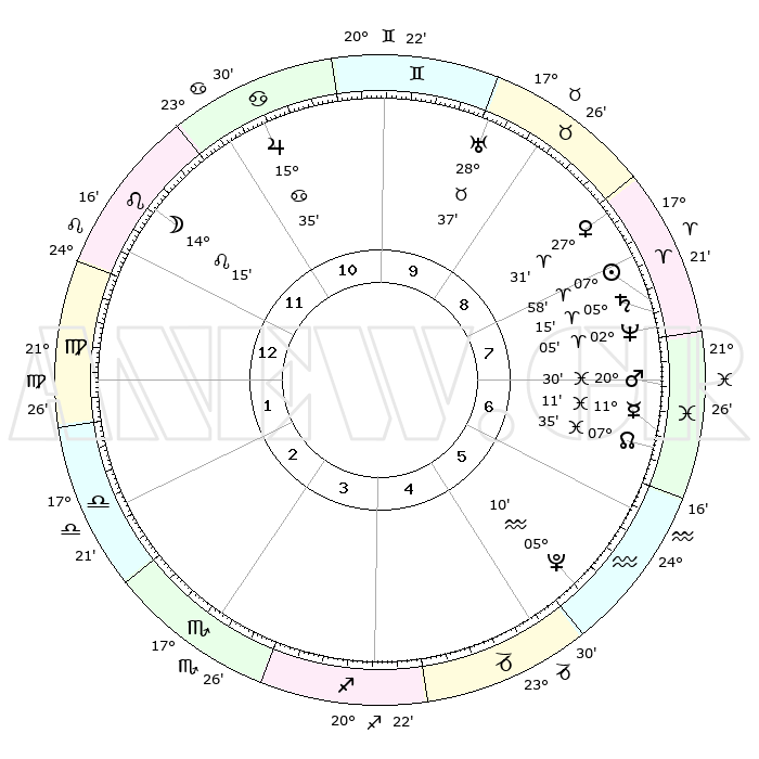 | | ΘΕΣΕΙΣ ΠΛΑΝΗΤΩΝ ΑΣΤΡΟΛΟΓΙΚΟΥ ΧΑΡΤΗ ΤΗΣ ΣΤΙΓΜΗΣ ΑΥΤΗΣ | | | | Πλανήτης | Ζώδιο | Μοίρες | Δεκαήμ. | Σε οίκο | Απόκλιση | | Ακμές των οίκων | | Ηλιος | Κριός | 07°03' | Πρώτο | 6 | 02 N 48 | | 1ος | 16°37' | Ζυγός | | Σελήνη | Λέων | 01°51' | Πρώτο | 10 | 22 N 48 | | 2ος | 14°16' | Σκορπιός | | Ερμής | Ιχθείς | 10°38' | Δεύτερο | 5 | 08 S 06 | | 3ος | 15°23' | Τοξότης | | Αφροδίτη | Κριός | 26°23' | Τρίτο | 7 | 09 N 36 | | 4ος | 18°49' | Αιγόκερως | | Αρης | Ιχθείς | 19°47' | Δεύτερο | 5 | 05 S 01 | | 5ος | 21°45' | Υδροχόος | | Δίας | Καρκίνος | 15°32' | Δεύτερο | 9 | 22 N 54 | | 6ος | 21°25' | Ιχθείς | | Κρόνος | Κριός | 05°08' | Πρώτο | 6 | 00 N 05 | | 7ος | 16°37' | Κριός | | Ουρανός | Ταύρος | 28°35' | Τρίτο | 8 | 19 N 40 | | 8ος | 14°16' | Ταύρος | | Ποσειδώνας | Κριός | 02°03' | Πρώτο | 6 | 00 S 23 | | 9ος | 15°23' | Δίδυμοι | | Πλούτωνας | Υδροχόος | 05°09' | Πρώτο | 4 | 22 S 48 | | 10ος | 18°49' | Καρκίνος | | Β. Δεσμός | Ιχθείς | 07°38' | Πρώτο | 5 | 08 S 42 | | 11ος | 21°45' | Λέων | | Ωροσκόπος | Ζυγός | 16°37' | Δεύτερο | | | 12ος | 21°25' | Παρθένος | | Μεσουράνημα | Καρκίνος | 18°49' | Δεύτερο | | | |