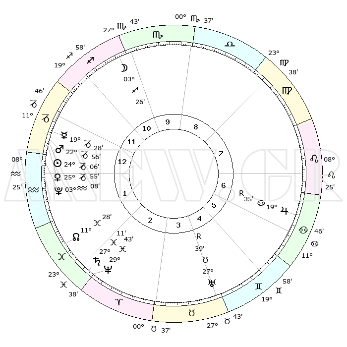 | | ΘΕΣΕΙΣ ΠΛΑΝΗΤΩΝ ΑΣΤΡΟΛΟΓΙΚΟΥ ΧΑΡΤΗ ΤΗΣ ΣΤΙΓΜΗΣ ΑΥΤΗΣ | | | | Πλανήτης | Ζώδιο | Μοίρες | Δεκαήμ. | Σε οίκο | Απόκλιση | | Ακμές των οίκων | | Ηλιος | Αιγόκερως | 24°01' | Τρίτο | 1 | 21 S 18 | | 1ος | 08°54' | Αιγόκερως | | Σελήνη | Τοξότης | 02°34' | Πρώτο | 11 | 25 S 39 | | 2ος | 18°19' | Υδροχόος | | Ερμής | Αιγόκερως | 19°21' | Δεύτερο | 1 | 23 S 45 | | 3ος | 28°38' | Ιχθείς | | Αφροδίτη | Αιγόκερως | 25°49' | Τρίτο | 1 | 21 S 55 | | 4ος | 01°01' | Ταύρος | | Αρης | Αιγόκερως | 22°52' | Τρίτο | 1 | 22 S 27 | | 5ος | 26°00' | Ταύρος | | Δίας | Καρκίνος | 19°35'R | Δεύτερο | 7 | 22 N 16 | | 6ος | 17°22' | Δίδυμοι | | Κρόνος | Ιχθείς | 27°11' | Τρίτο | 2 | 03 S 09 | | 7ος | 08°54' | Καρκίνος | | Ουρανός | Ταύρος | 27°39'R | Τρίτο | 5 | 19 N 26 | | 8ος | 18°19' | Λέων | | Ποσειδώνας | Ιχθείς | 29°43' | Τρίτο | 3 | 01 S 20 | | 9ος | 28°38' | Παρθένος | | Πλούτωνας | Υδροχόος | 03°08' | Πρώτο | 1 | 23 S 08 | | 10ος | 01°01' | Σκορπιός | | Β. Δεσμός | Ιχθείς | 11°28' | Δεύτερο | 2 | 07 S 16 | | 11ος | 26°00' | Σκορπιός | | Ωροσκόπος | Αιγόκερως | 08°54' | Πρώτο | | | 12ος | 17°22' | Τοξότης | | Μεσουράνημα | Σκορπιός | 01°01' | Πρώτο | | | |