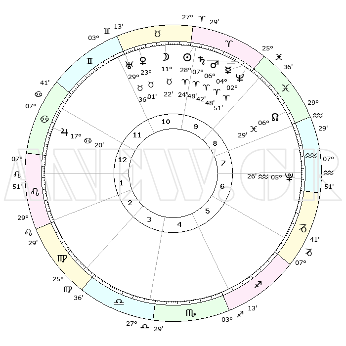 | | ΘΕΣΕΙΣ ΠΛΑΝΗΤΩΝ ΑΣΤΡΟΛΟΓΙΚΟΥ ΧΑΡΤΗ ΤΗΣ ΣΤΙΓΜΗΣ ΑΥΤΗΣ | | | | Πλανήτης | Ζώδιο | Μοίρες | Δεκαήμ. | Σε οίκο | Απόκλιση | | Ακμές των οίκων | | Ηλιος | Κριός | 28°21' | Τρίτο | 10 | 10 N 53 | | 1ος | 18°39' | Καρκίνος | | Σελήνη | Ταύρος | 10°24' | Δεύτερο | 11 | 19 N 14 | | 2ος | 09°09' | Λέων | | Ερμής | Κριός | 04°42' | Πρώτο | 10 | 00 S 33 | | 3ος | 02°43' | Παρθένος | | Αφροδίτη | Ταύρος | 22°56' | Τρίτο | 11 | 18 N 49 | | 4ος | 02°07' | Ζυγός | | Αρης | Κριός | 06°39' | Πρώτο | 10 | 01 N 45 | | 5ος | 08°03' | Σκορπιός | | Δίας | Καρκίνος | 17°20' | Δεύτερο | 12 | 22 N 41 | | 6ος | 15°40' | Τοξότης | | Κρόνος | Κριός | 07°47' | Πρώτο | 10 | 01 N 07 | | 7ος | 18°39' | Αιγόκερως | | Ουρανός | Ταύρος | 29°36' | Τρίτο | 11 | 19 N 54 | | 8ος | 09°09' | Υδροχόος | | Ποσειδώνας | Κριός | 02°51' | Πρώτο | 10 | 00 S 05 | | 9ος | 02°43' | Ιχθείς | | Πλούτωνας | Υδροχόος | 05°26' | Πρώτο | 7 | 22 S 47 | | 10ος | 02°07' | Κριός | | Β. Δεσμός | Ιχθείς | 06°29' | Πρώτο | 9 | 09 S 08 | | 11ος | 08°03' | Ταύρος | | Ωροσκόπος | Καρκίνος | 18°39' | Δεύτερο | | | 12ος | 15°40' | Δίδυμοι | | Μεσουράνημα | Κριός | 02°07' | Πρώτο | | | |